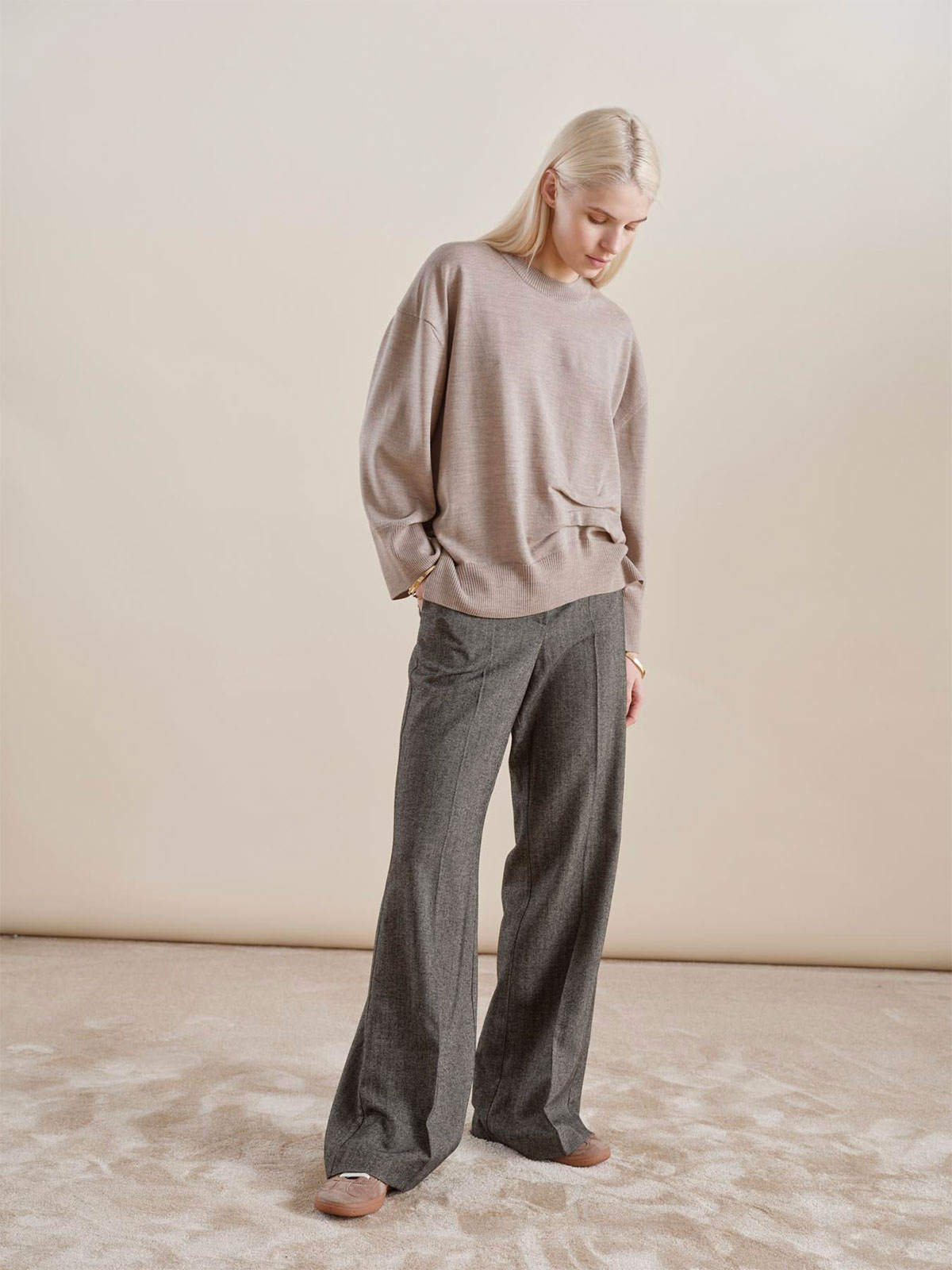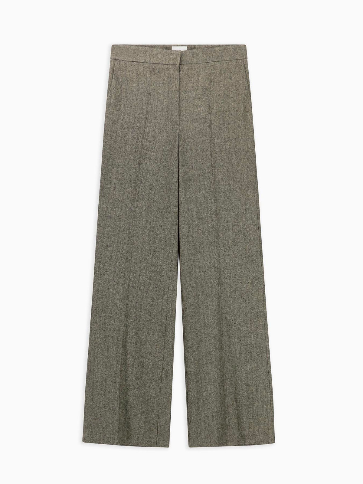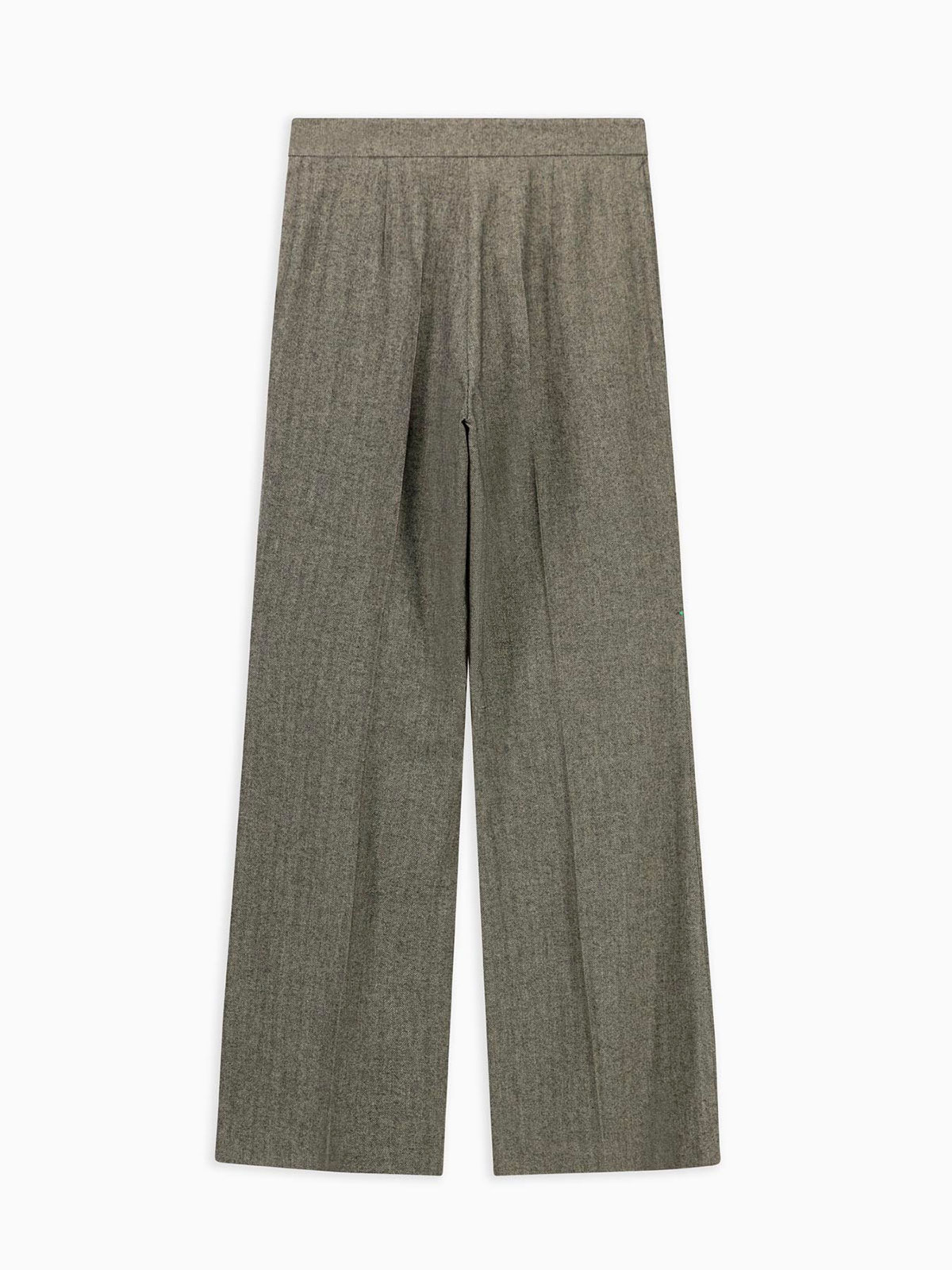 Pantalone in flanella di lana spigata, due tasche alla francese sul davanti, chiusura centrale con zip nascosta e gancio, piega sul davanti, vestibilità aderente nella parte superiore.