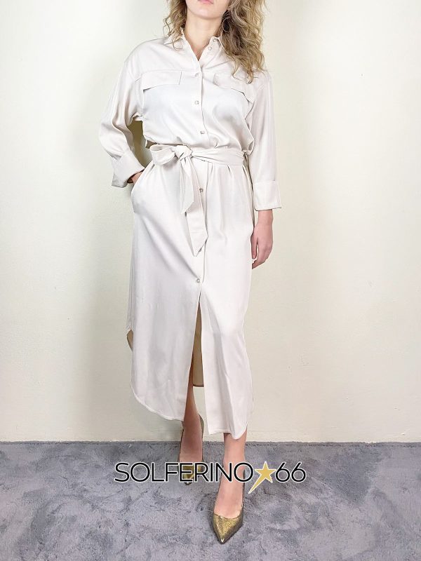 Abito midi chemisier a manica lunga con taschine con pattina applicate, cintura in vita, tasche a scomparsa, mantellina sul retro e fondo stondato.