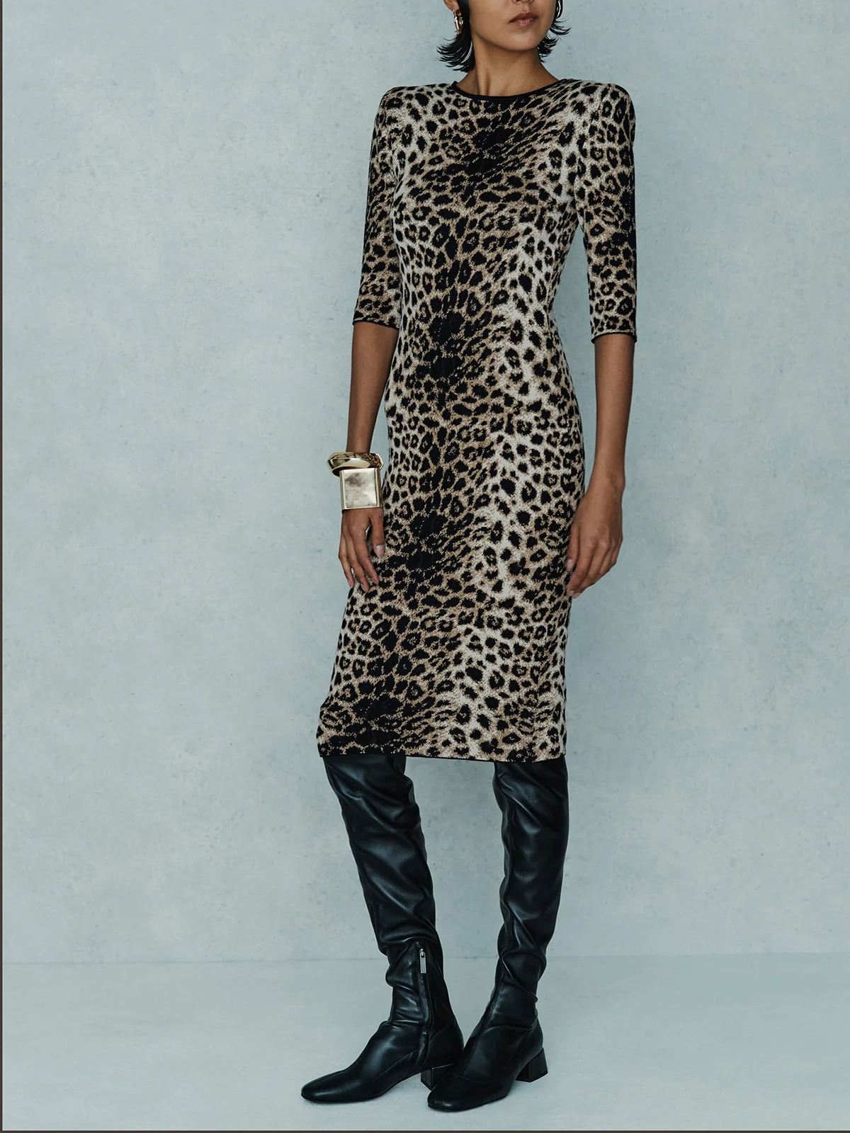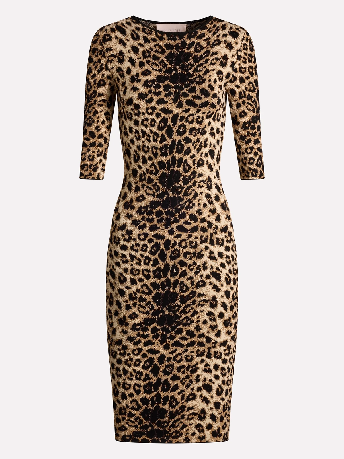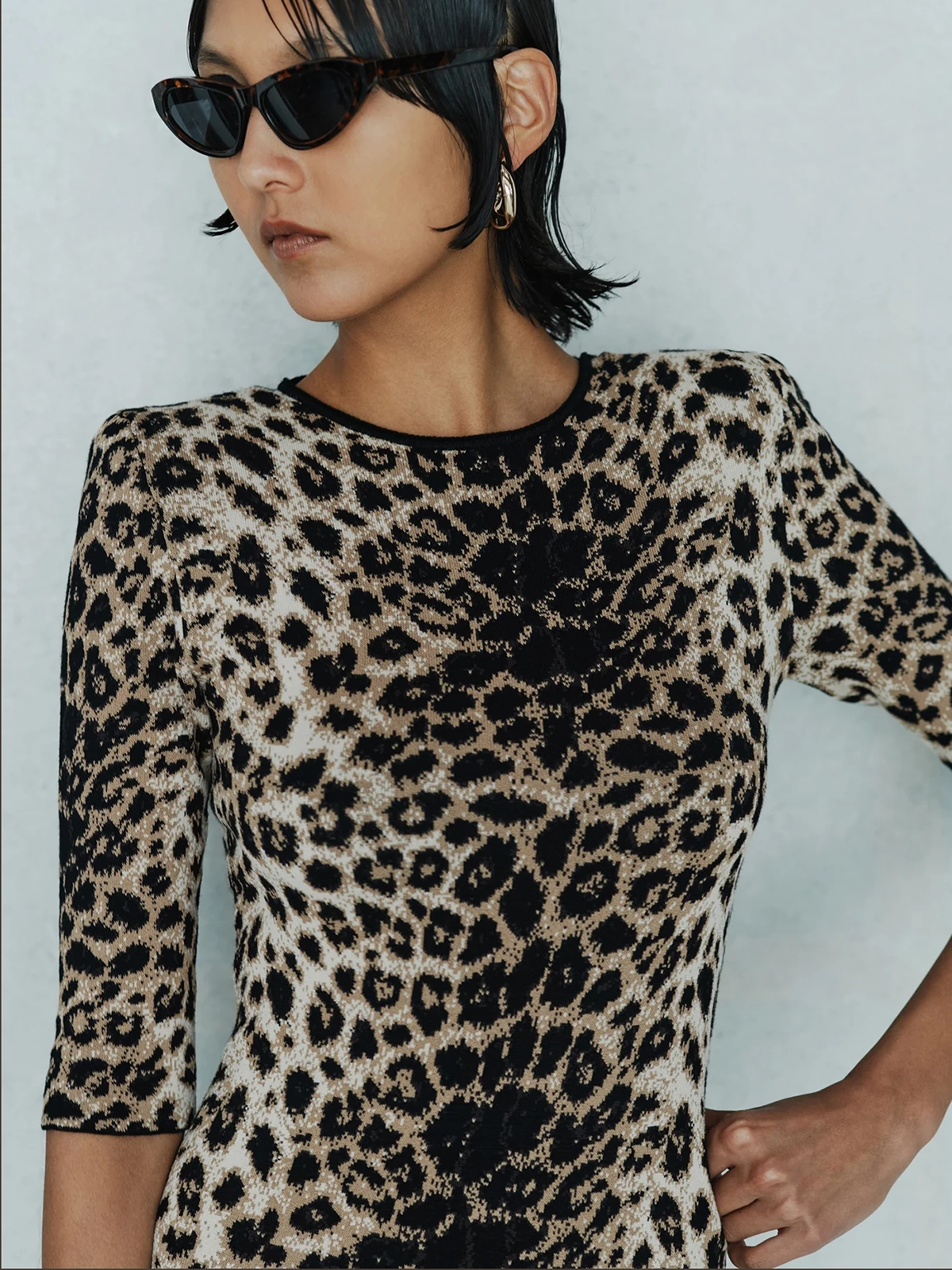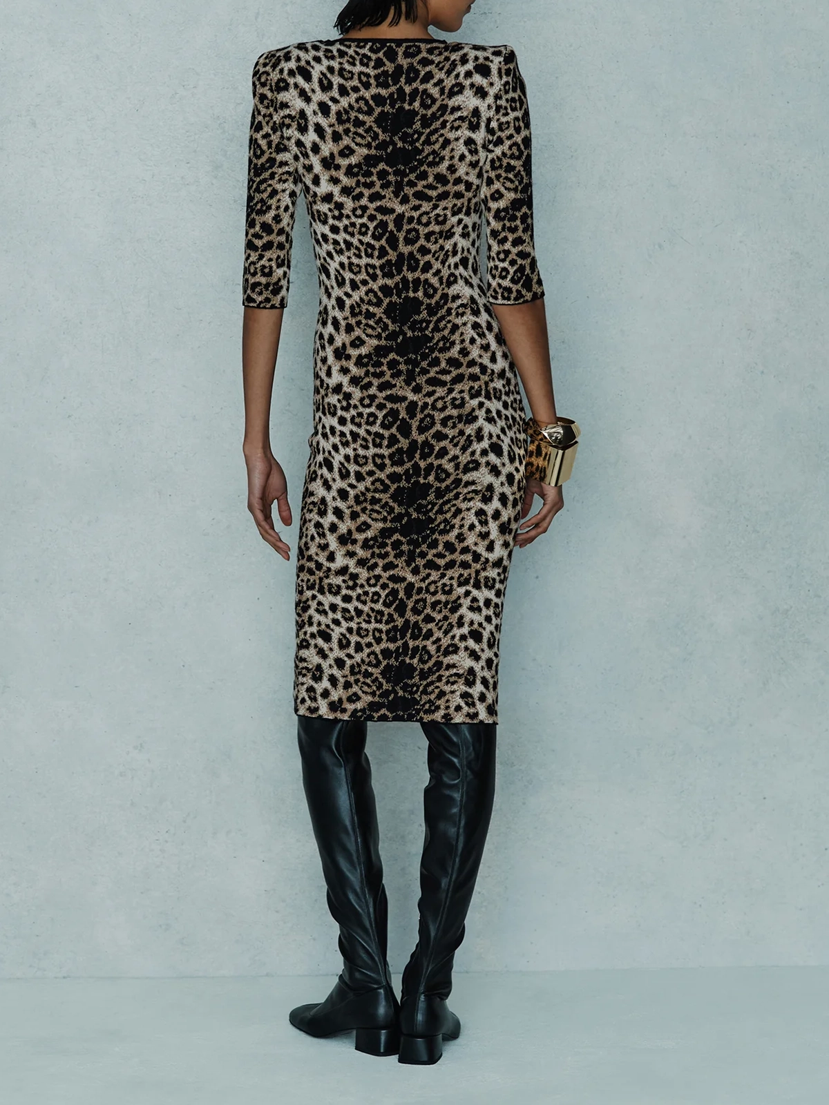 Abito midi in tessuto stretch di viscosa con stampa animalier, spalline imbottite e manica corta.