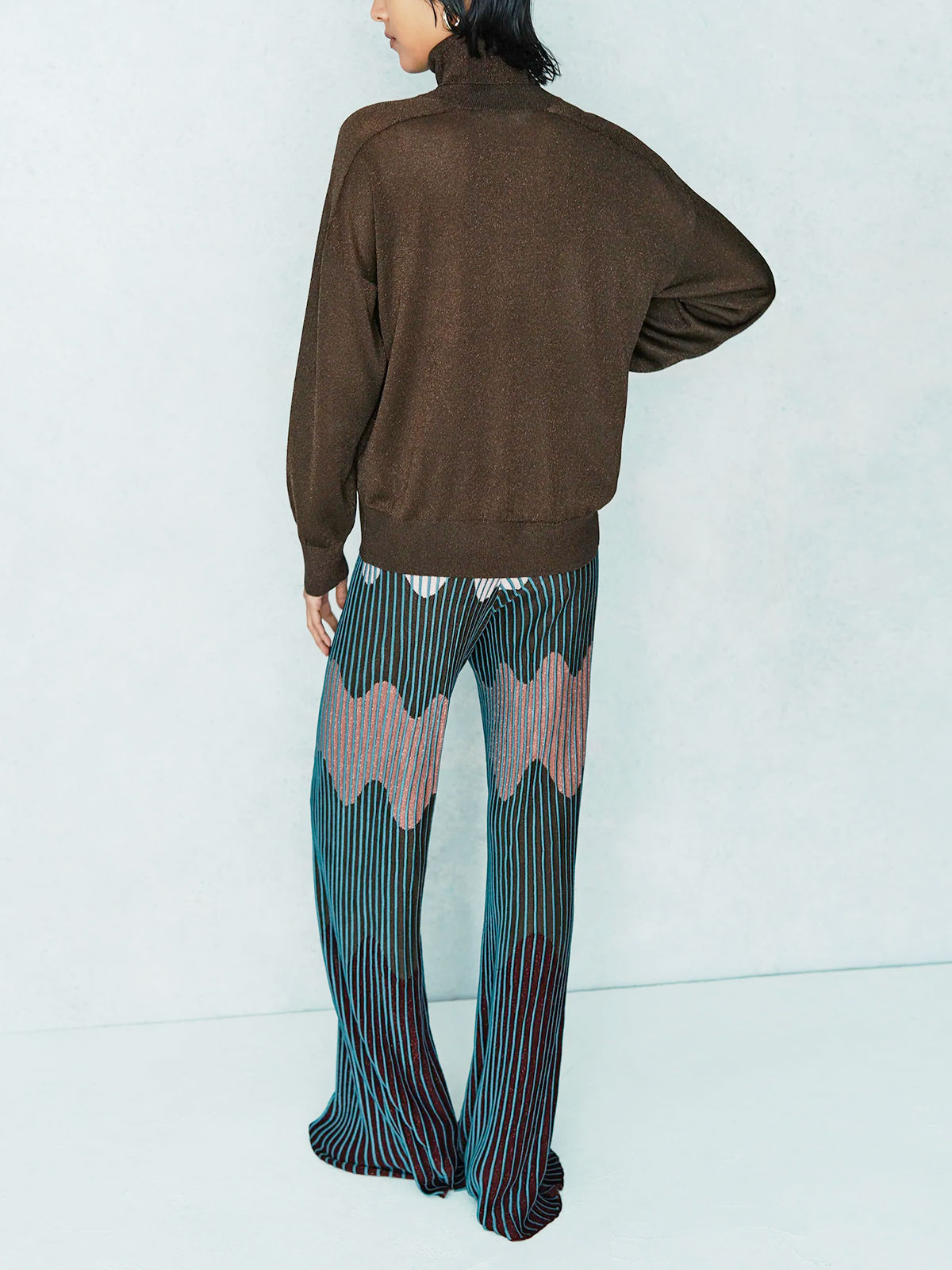 Dolcevita in filato lame’ a maniche lunghe, vestibilità comoda, spalla scesa, lunghezza al bacino.