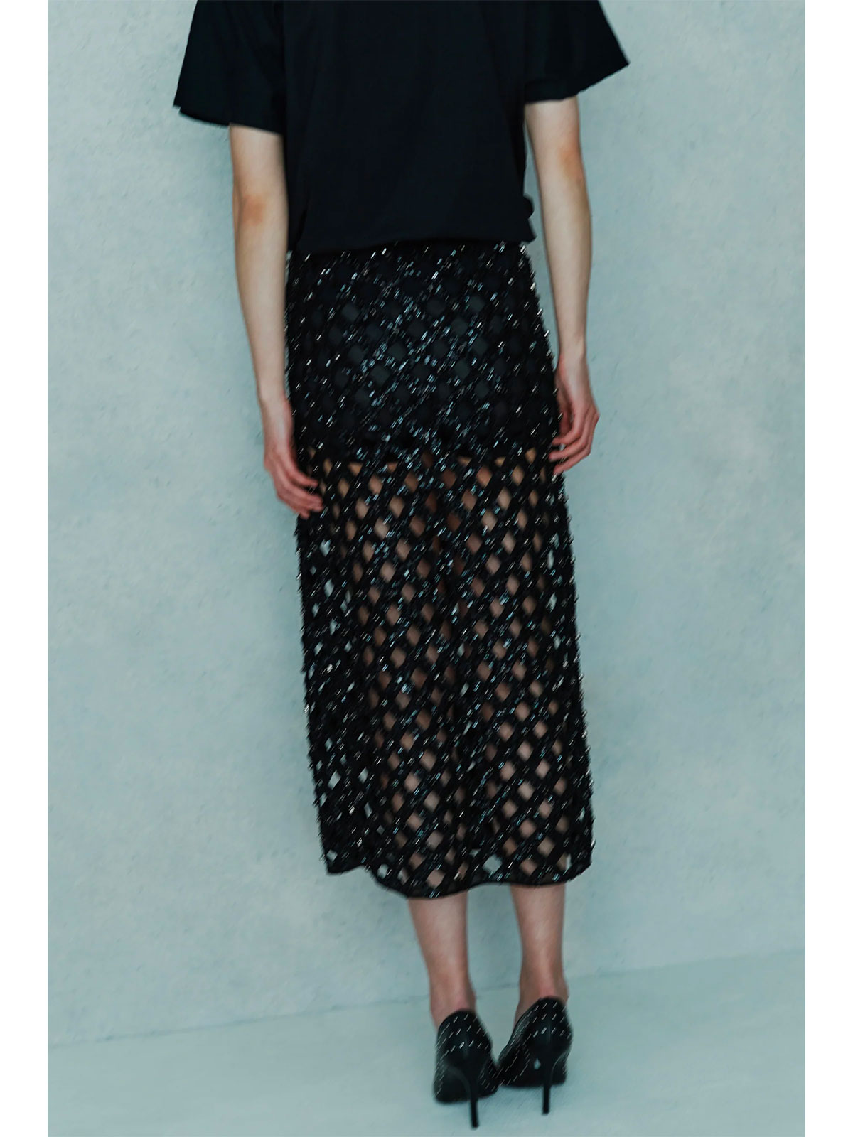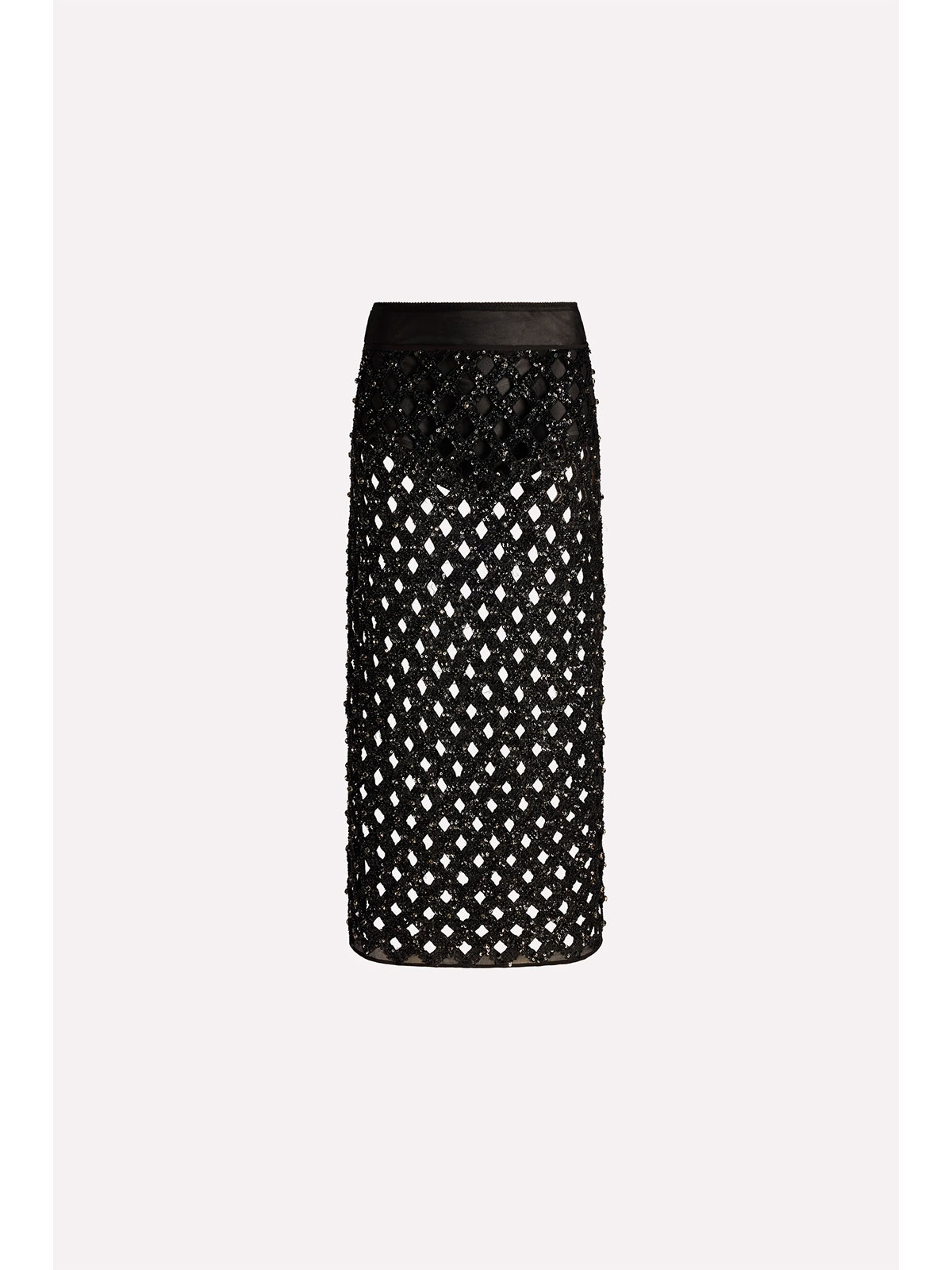 Gonna midi a rombi ricamati con paillettes, culotte interna staccabile, zip laterale, vestibilità slim.