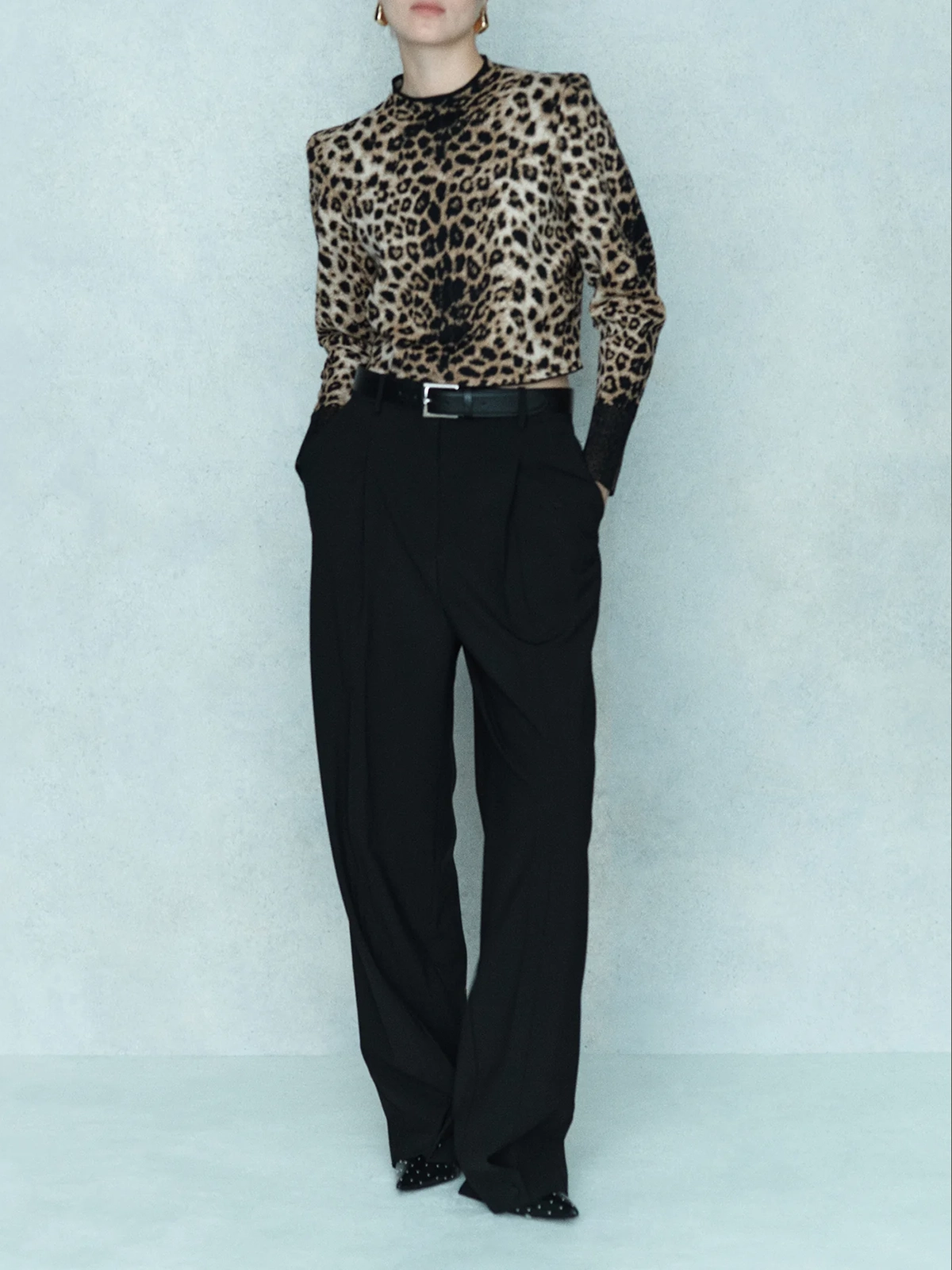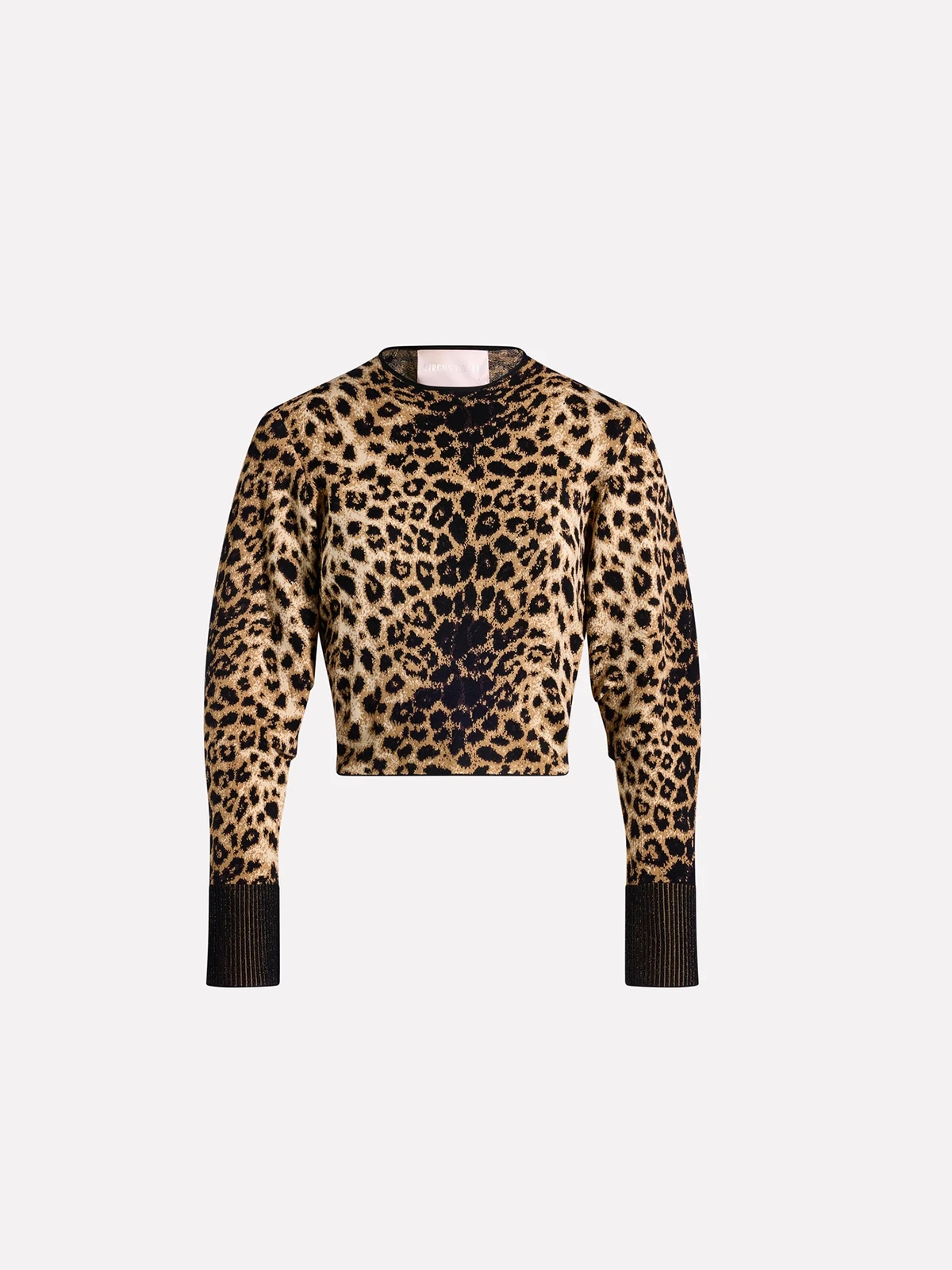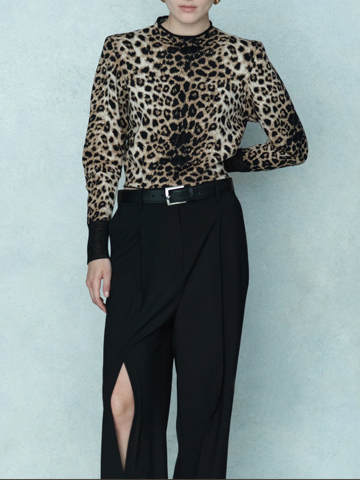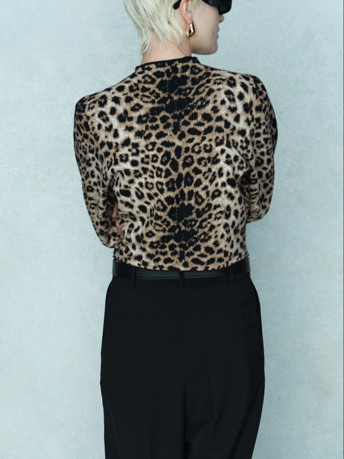 Maglia in viscosa stampa animalier, girocollo, manica lunga con dettaglio arricciatura.