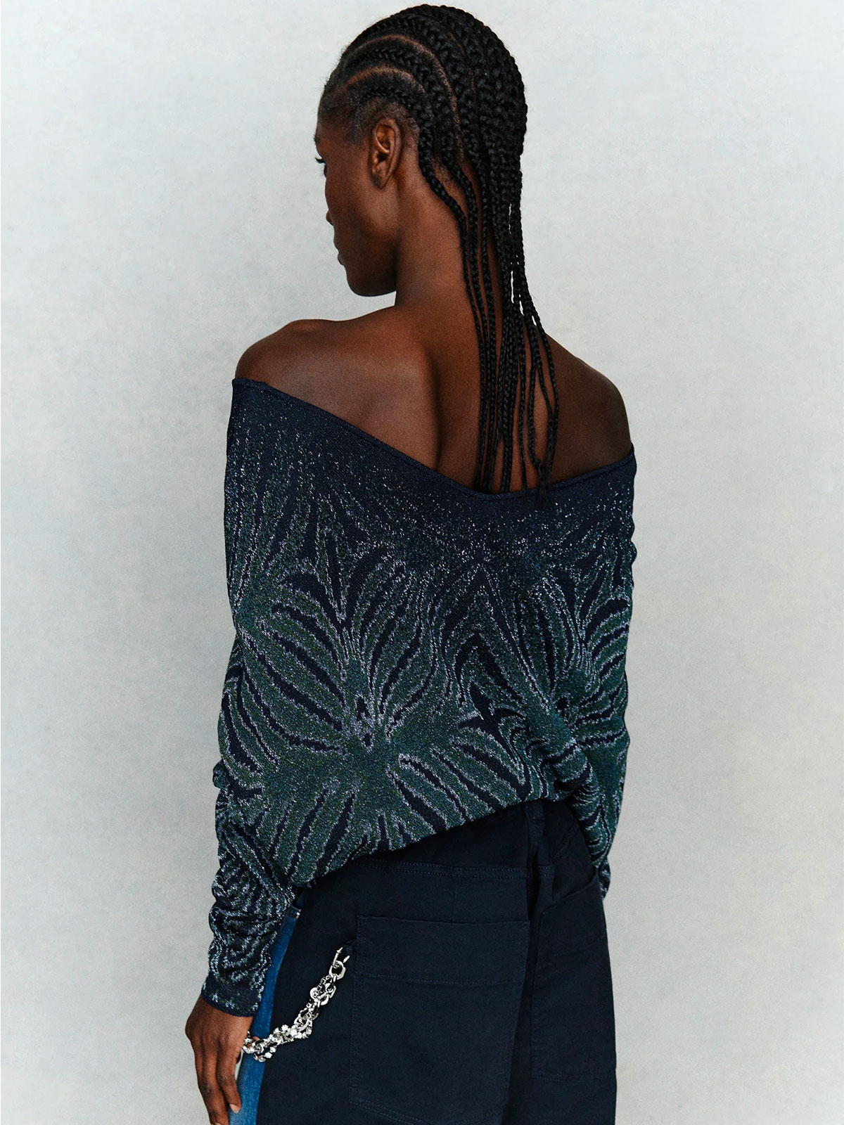 Maglia in viscosa jacquard lamè con possibilità di doppio utilizzo, maniche dolmen, vestibilità slim, lunghezza in vita.