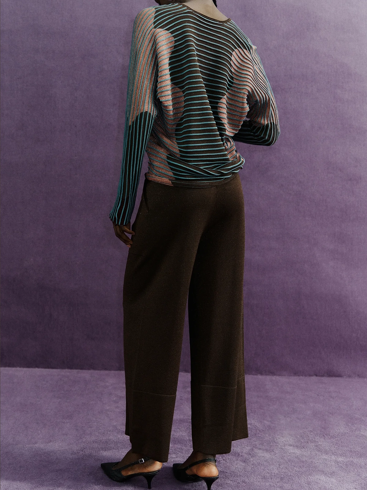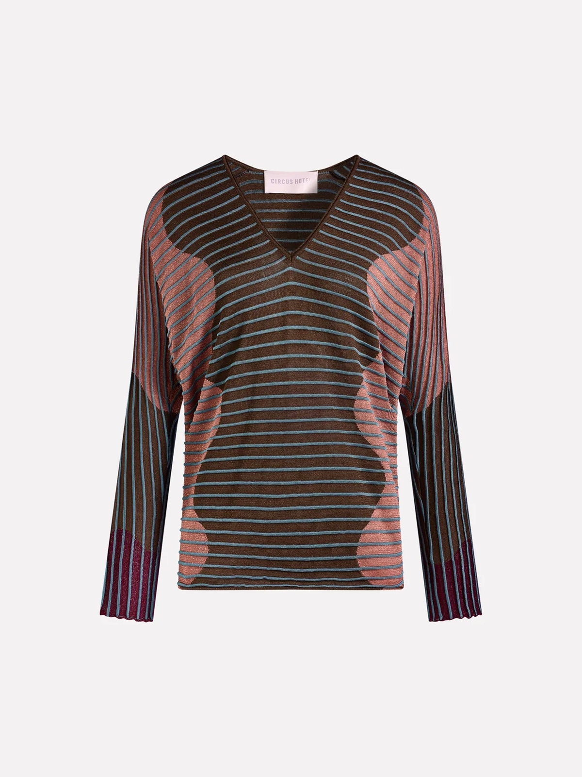 Maglia morbida in viscosa lurex moro-rosa-carta da zucchero, scollo a V, manica lunga a pipistrello.