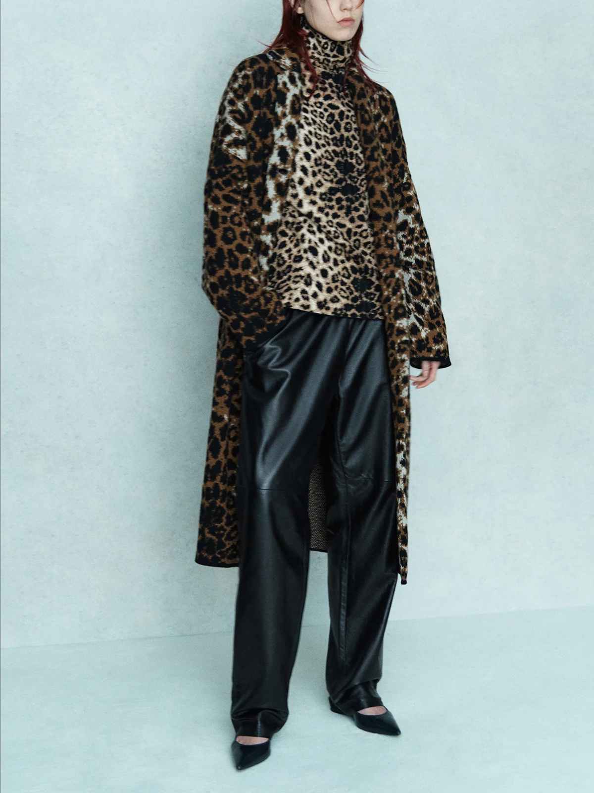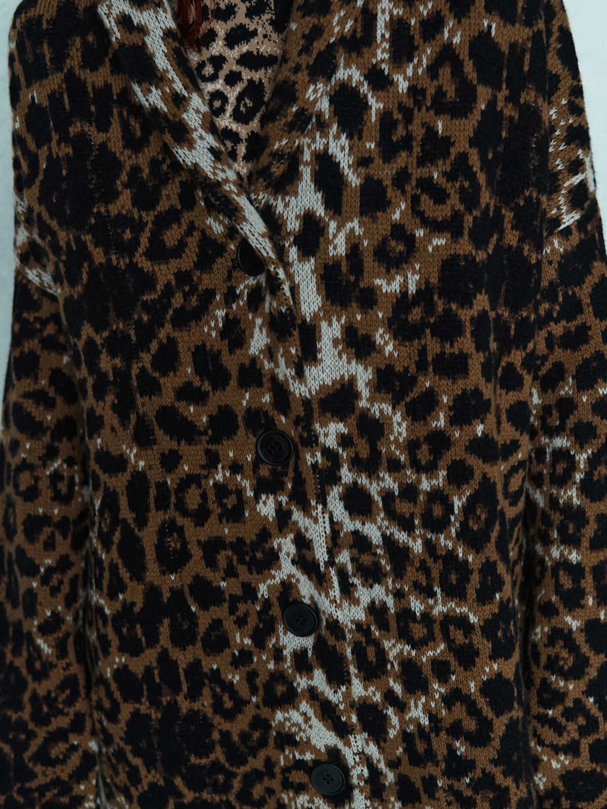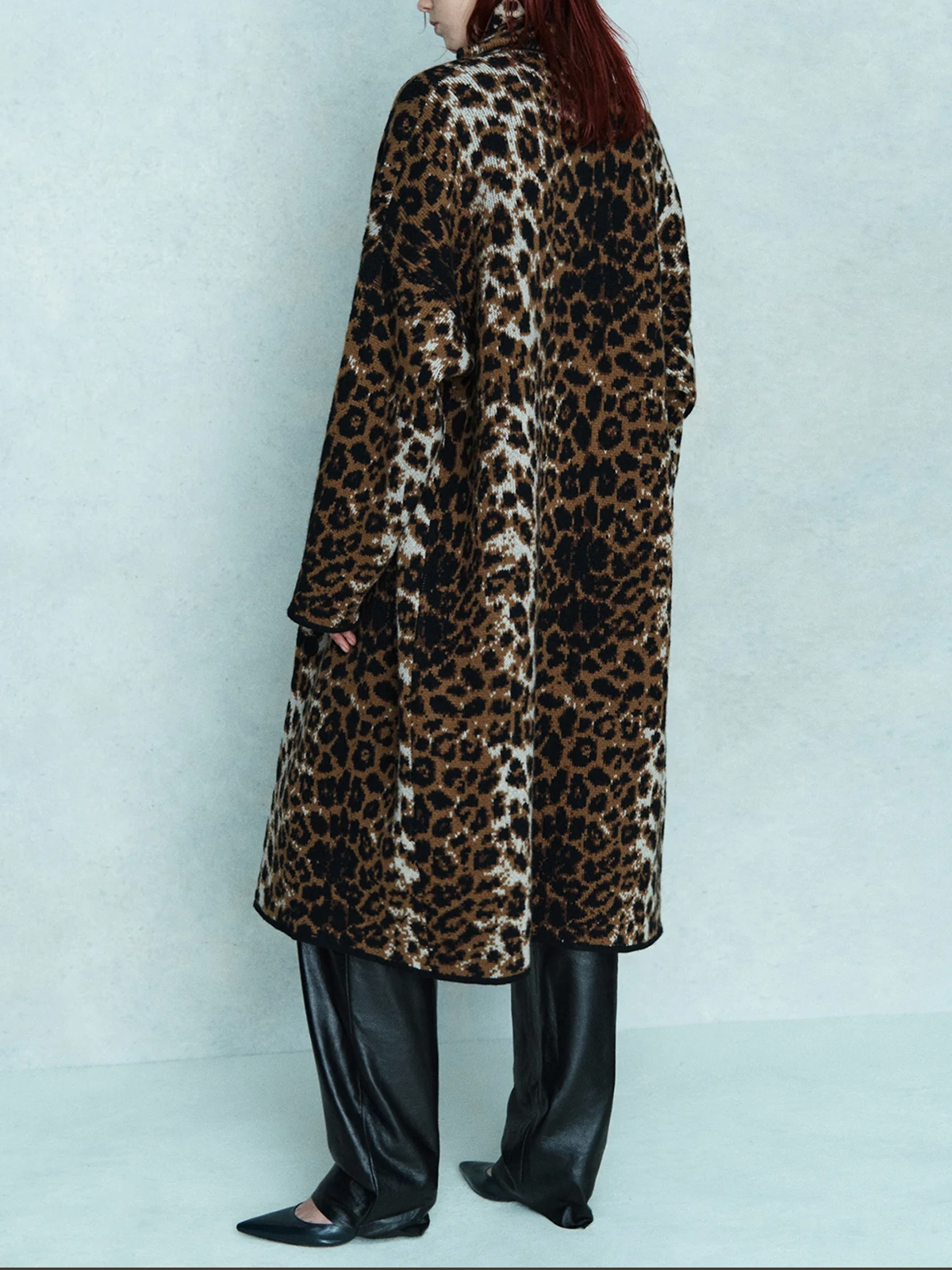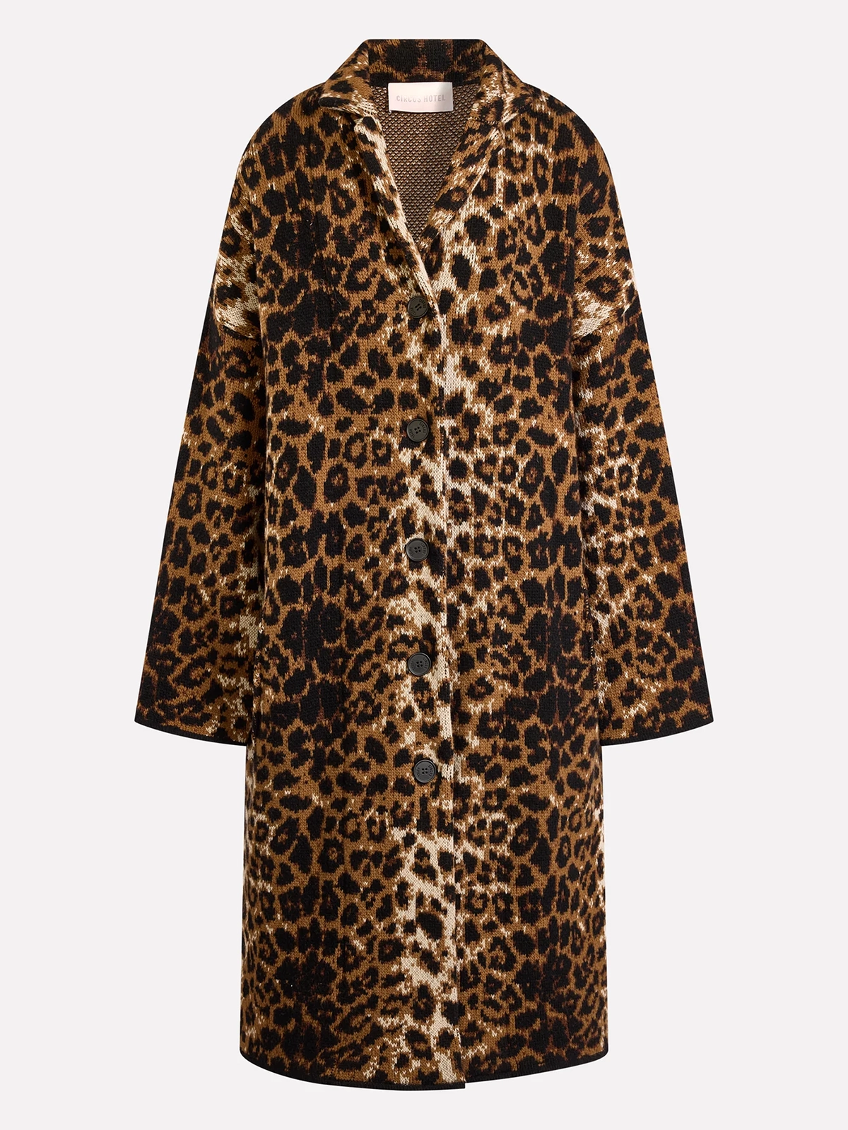 Maxi cappotto stampa animalier in lana, monopetto con chiusura con bottoni, collo con rever e tasche a scomparsa.