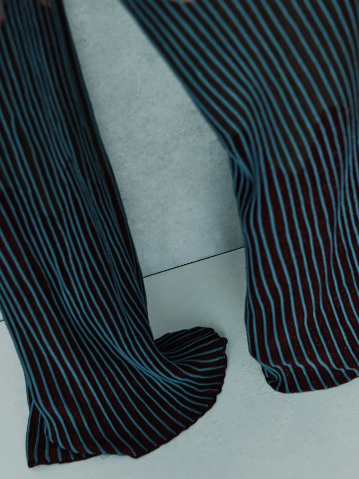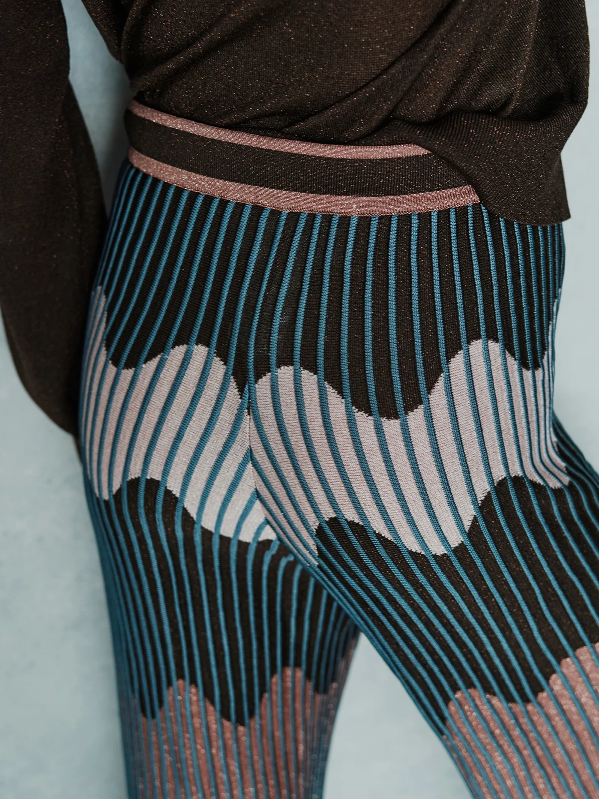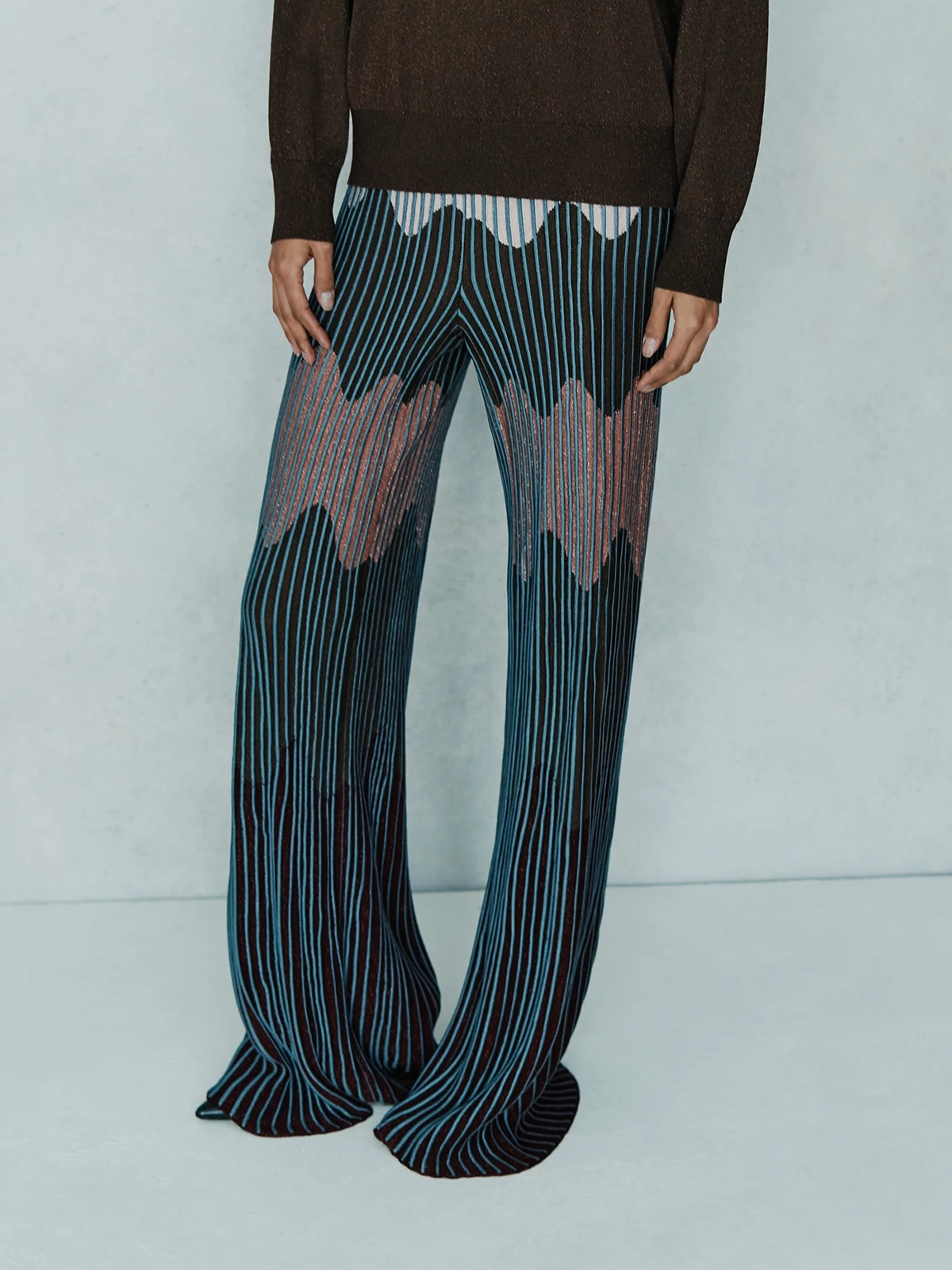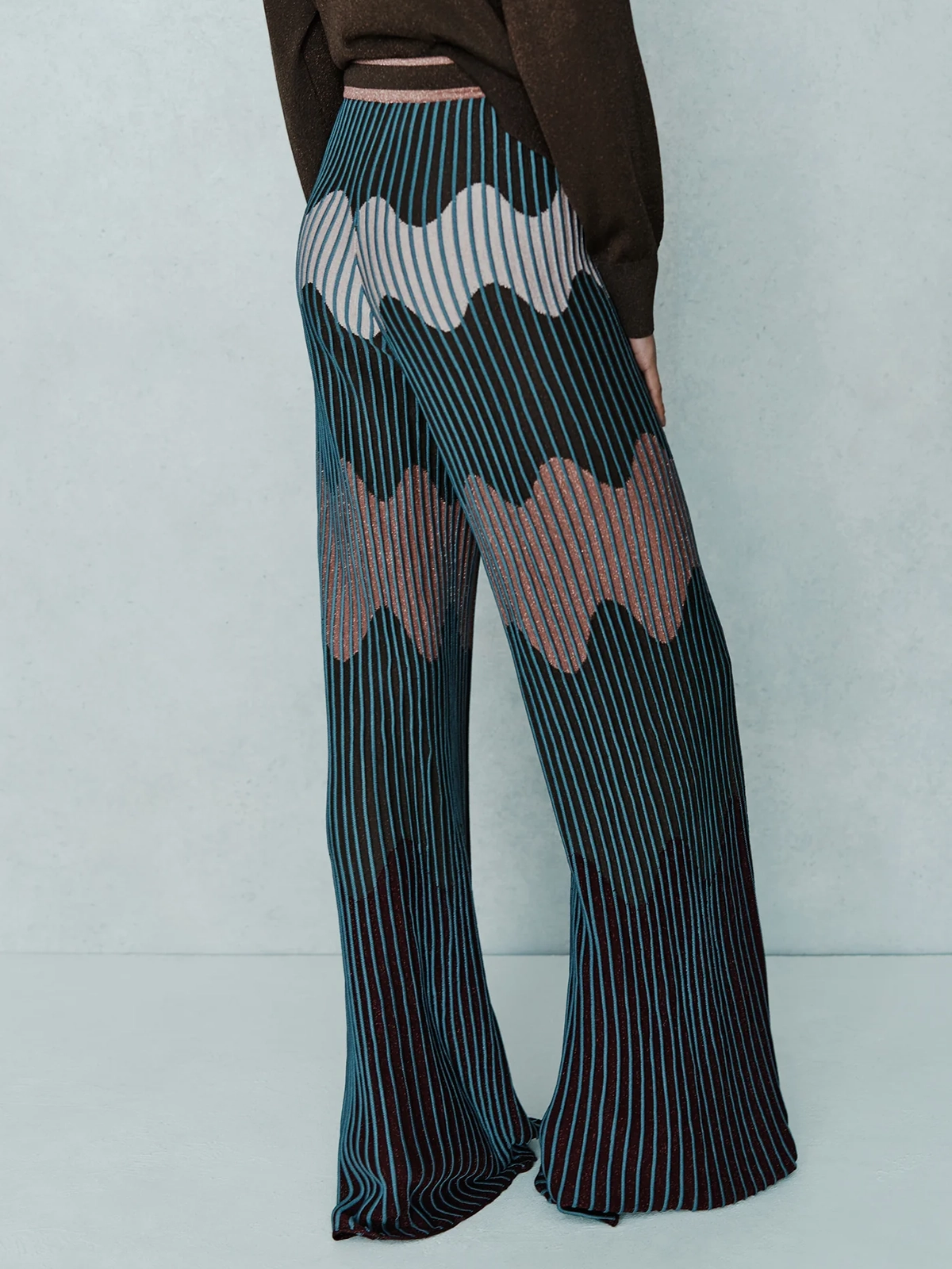 Pantalone modello wide leg con disegno jacquard Waves in filo lame’, vita alta con fascino elastico in vita.