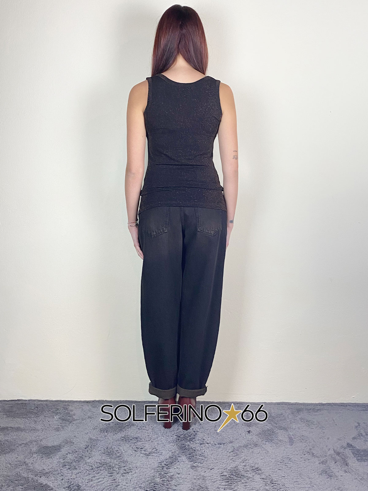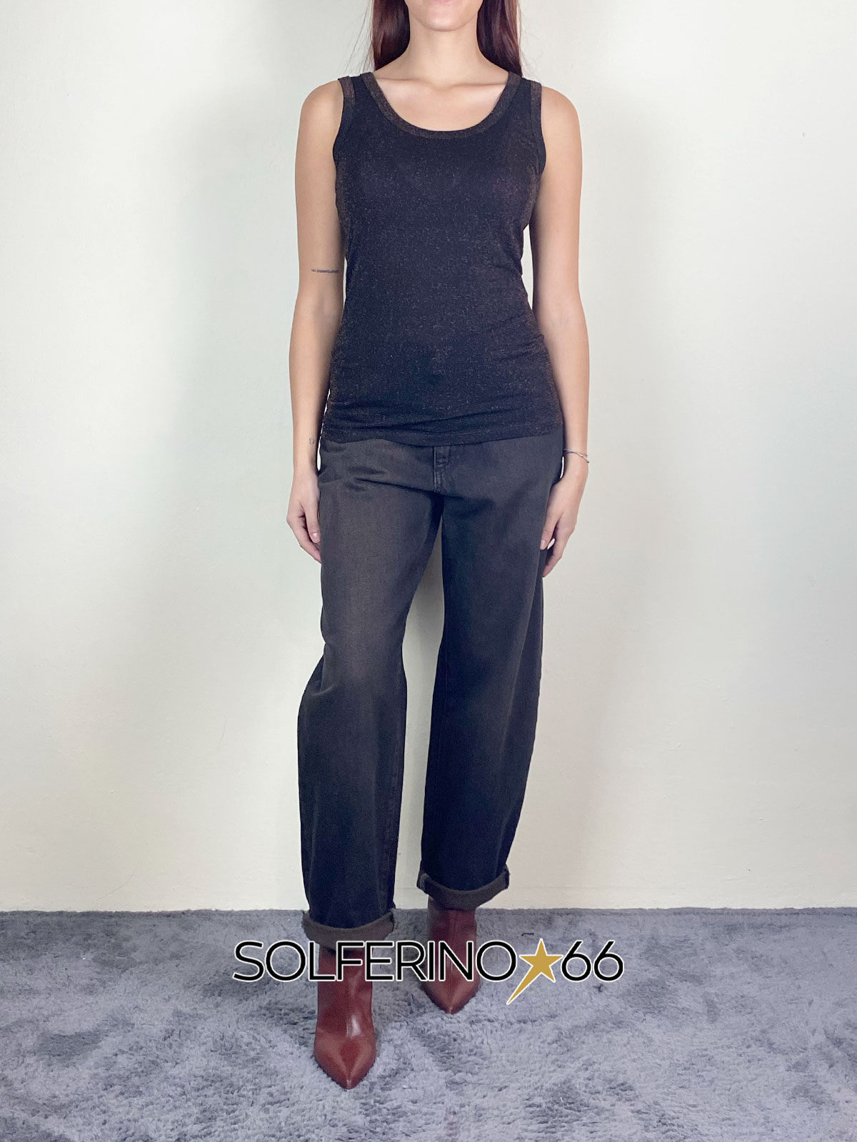 Canotta in maglia di viscosa lurex con scollo muratore.