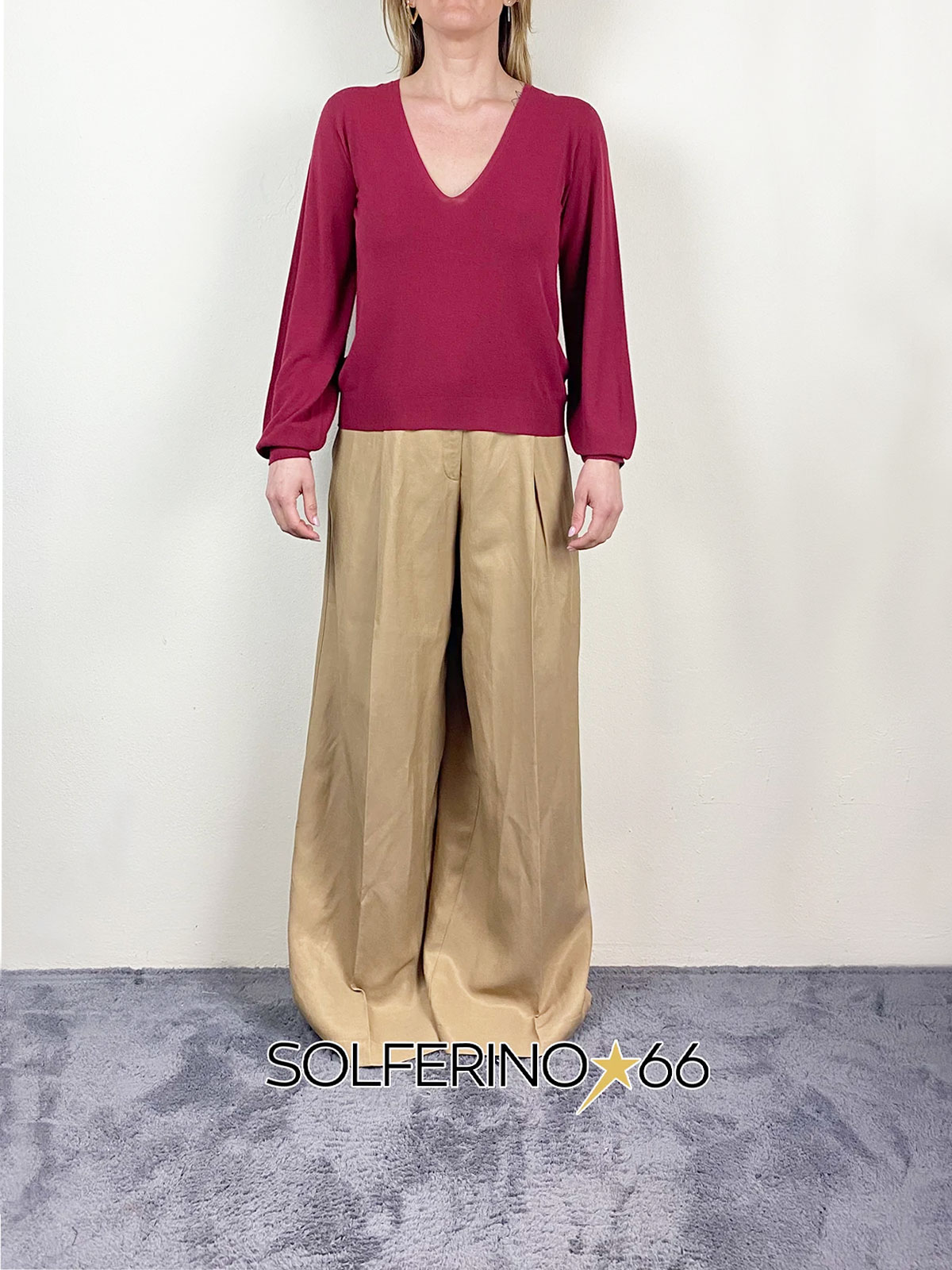 Maglia a manica lunga con scollo a V, polsini e rovescino sul fondo.