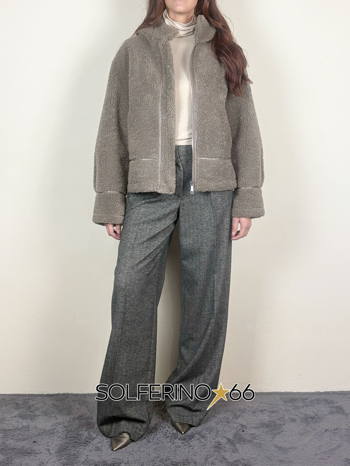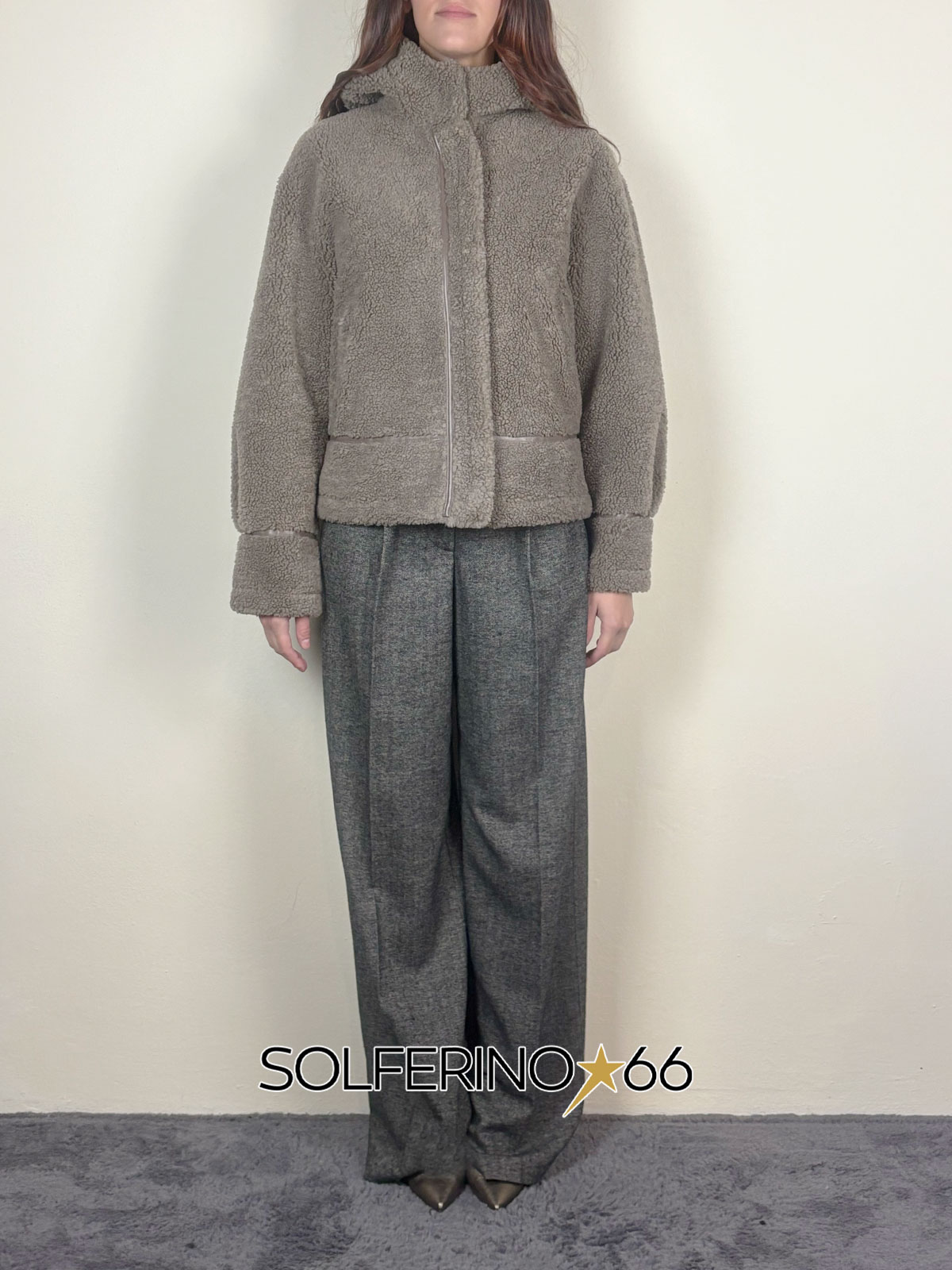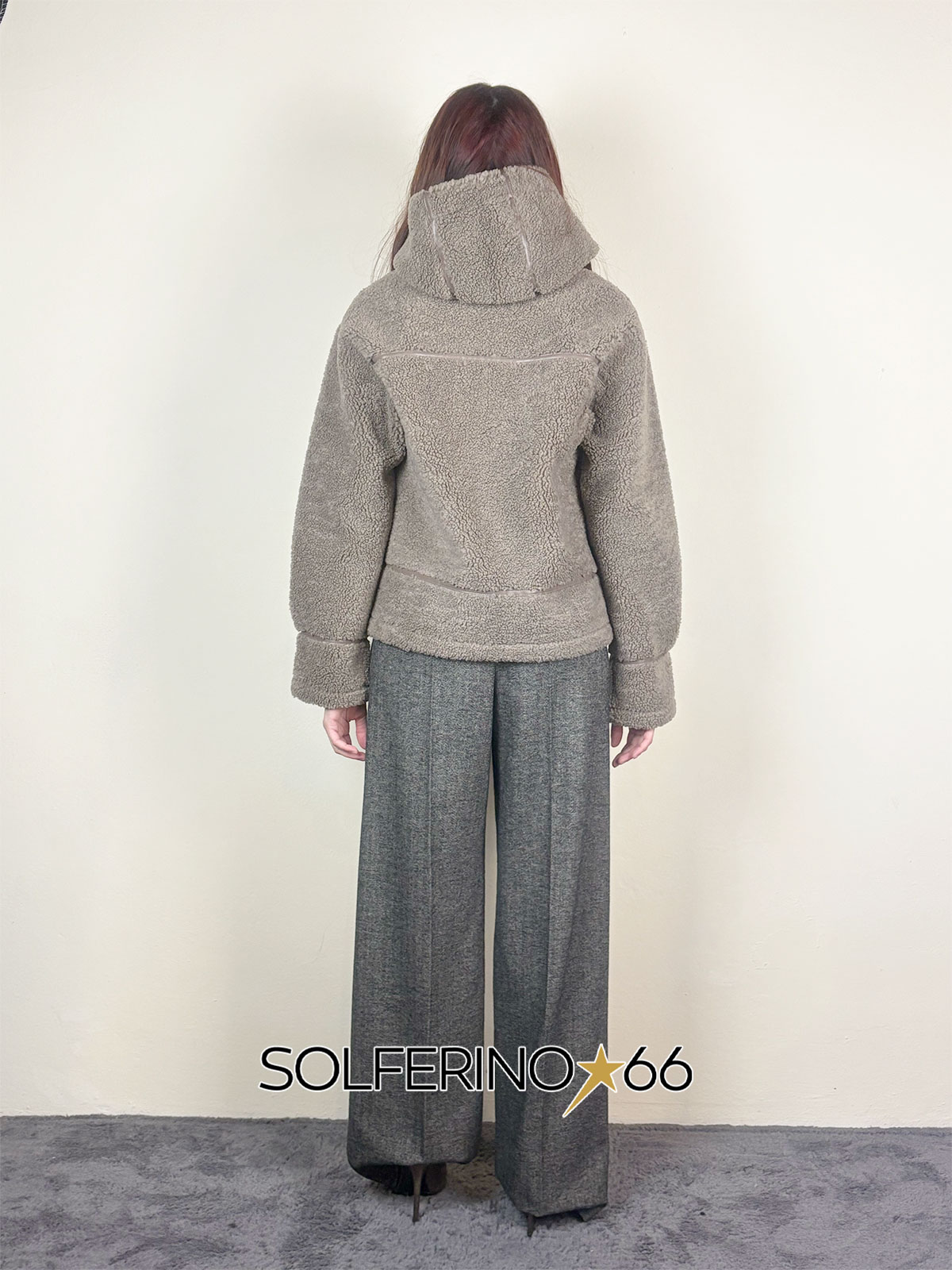 Giacca corta in eco montone con cappuccio, finiture eco pelle e chiusura con zip. Interno in eco suede.