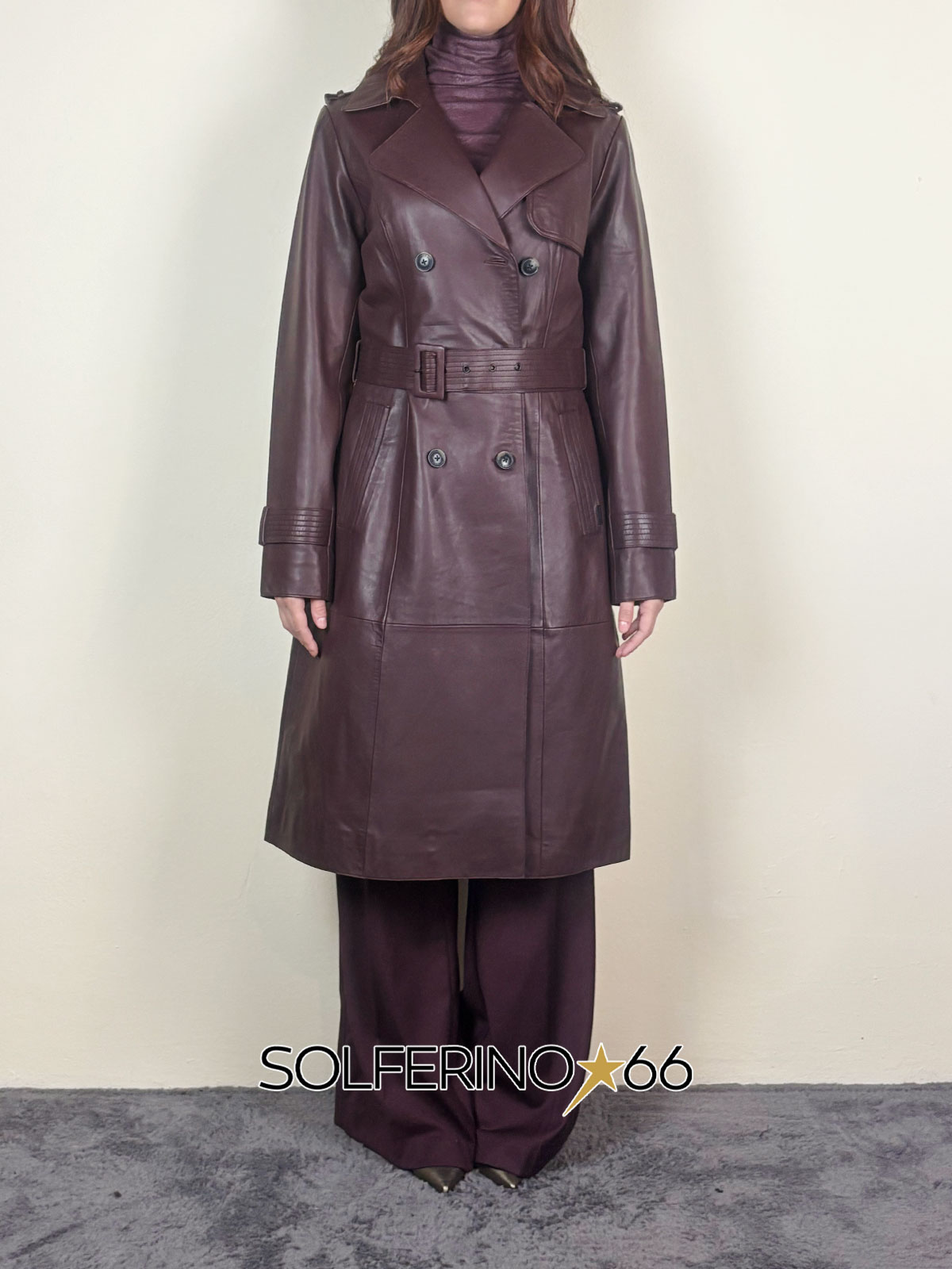 Trench in pelle doppiopetto con cintura abbinata in vita.