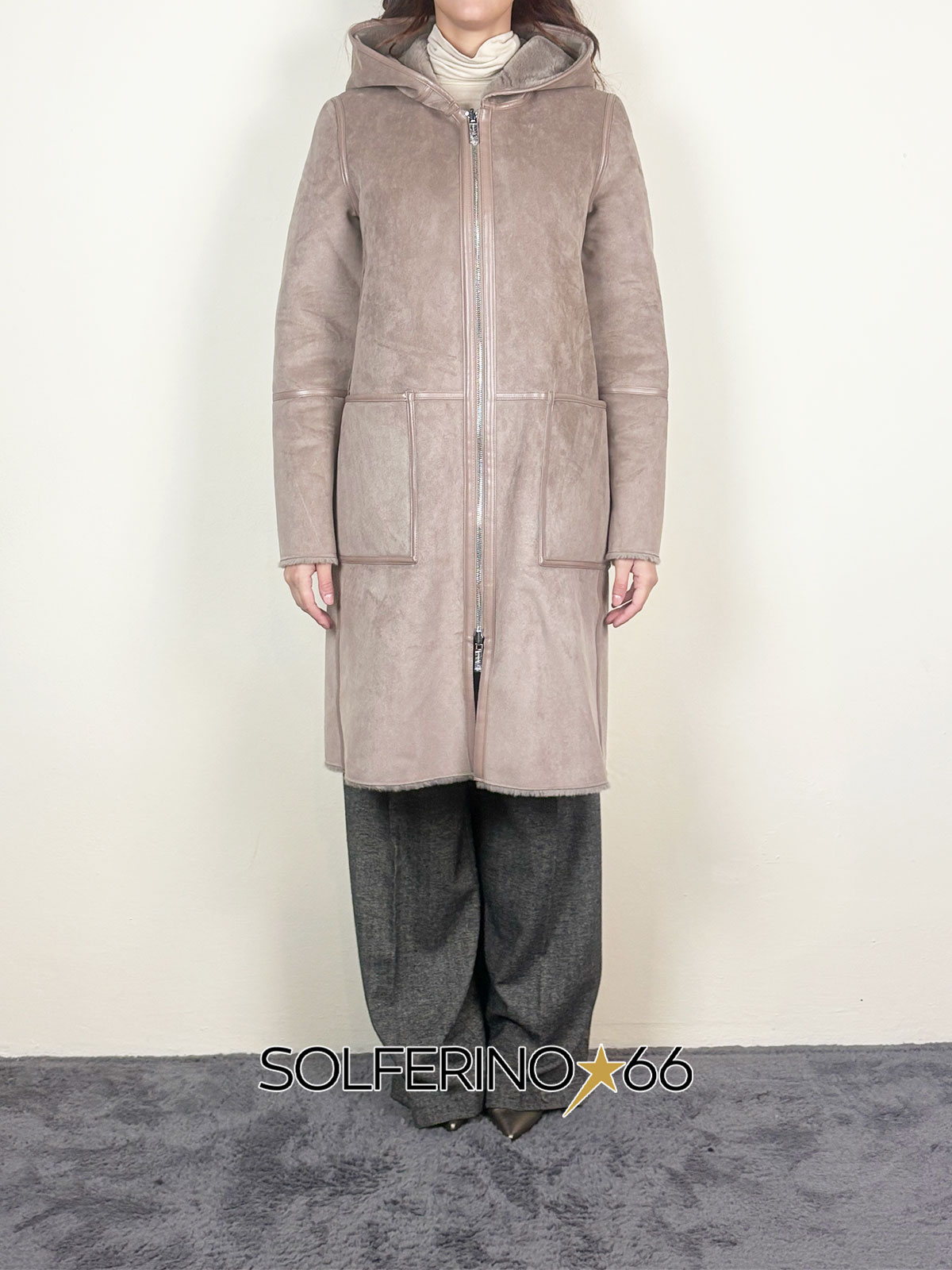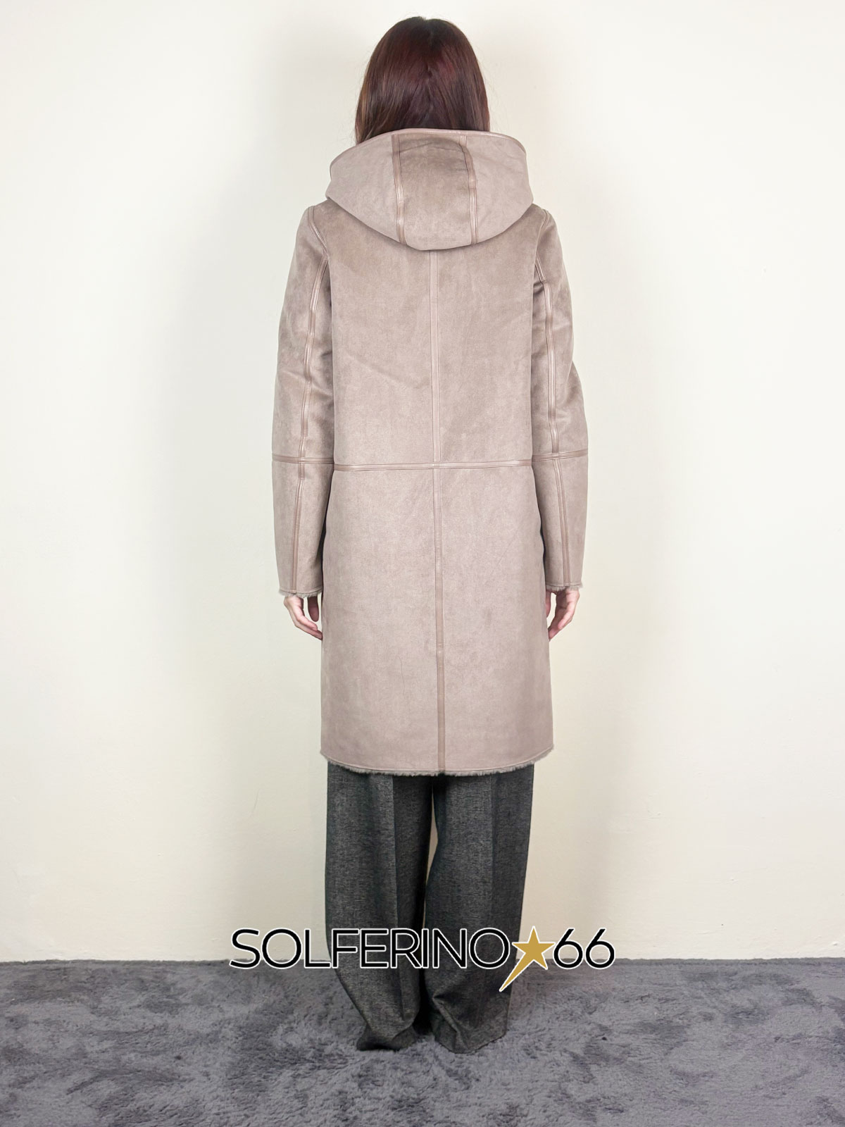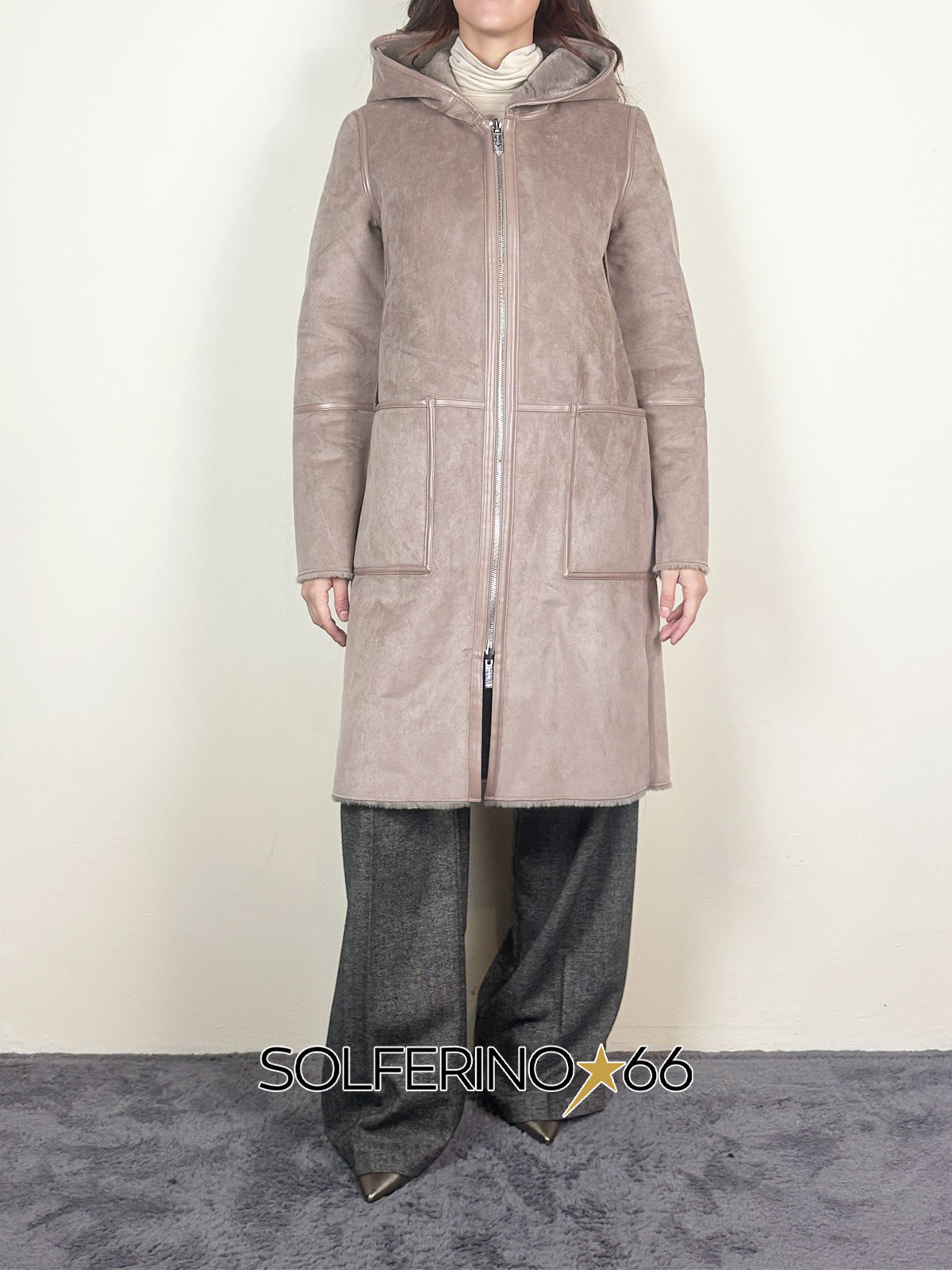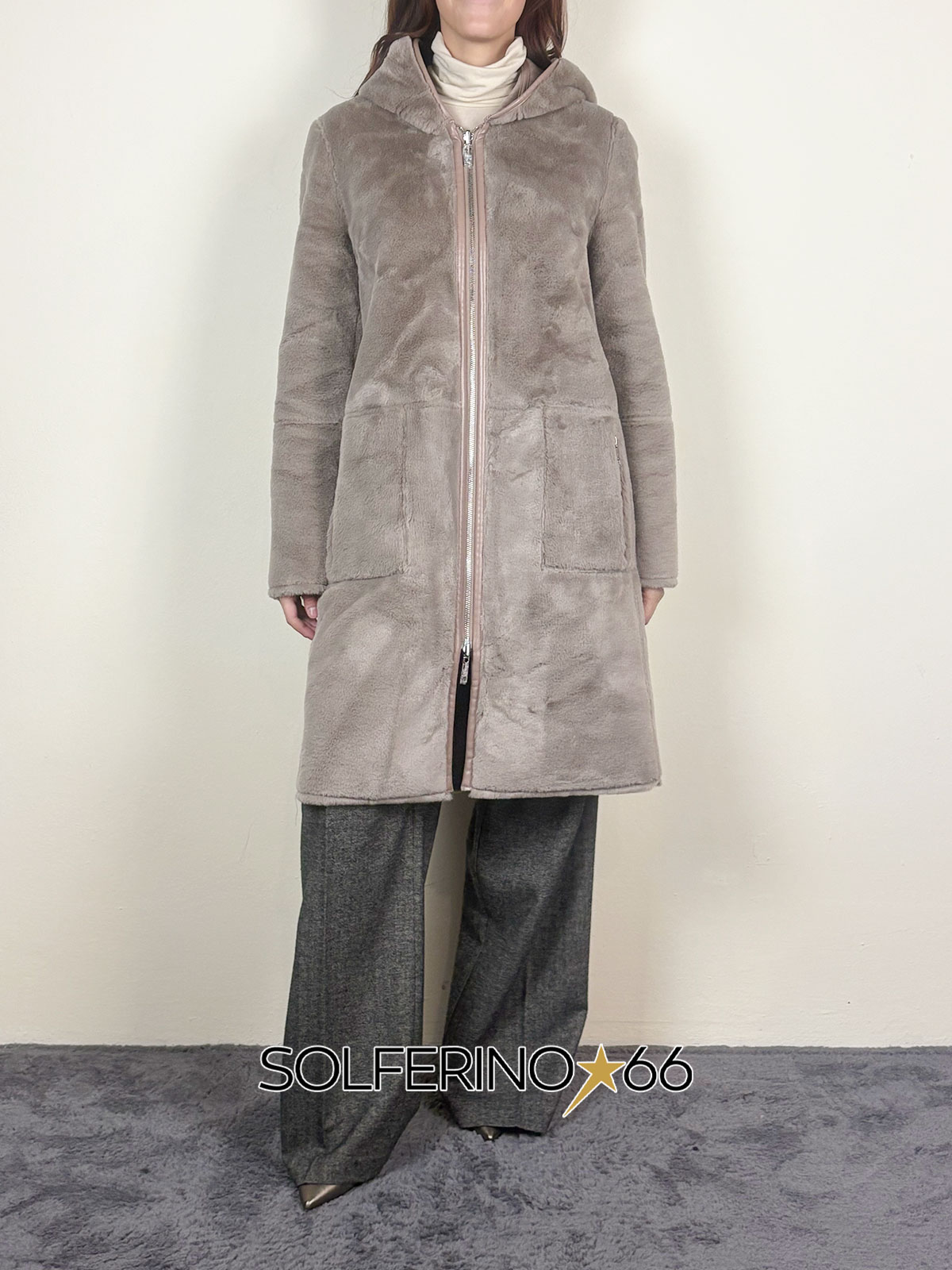Eco montone reversibile con interno in eco pelliccia, cappuccio, chiusura con zip e finiture ecopelle.