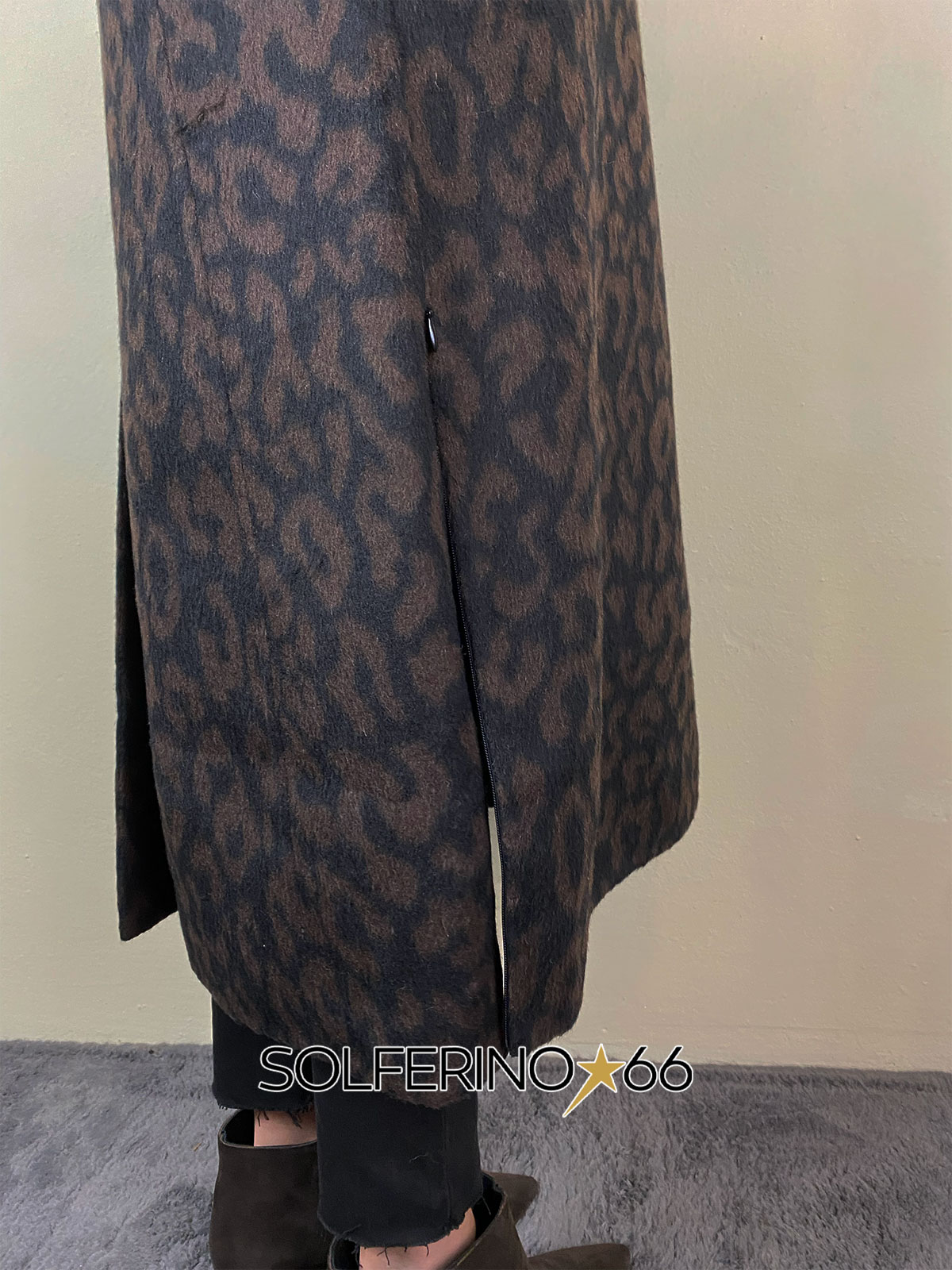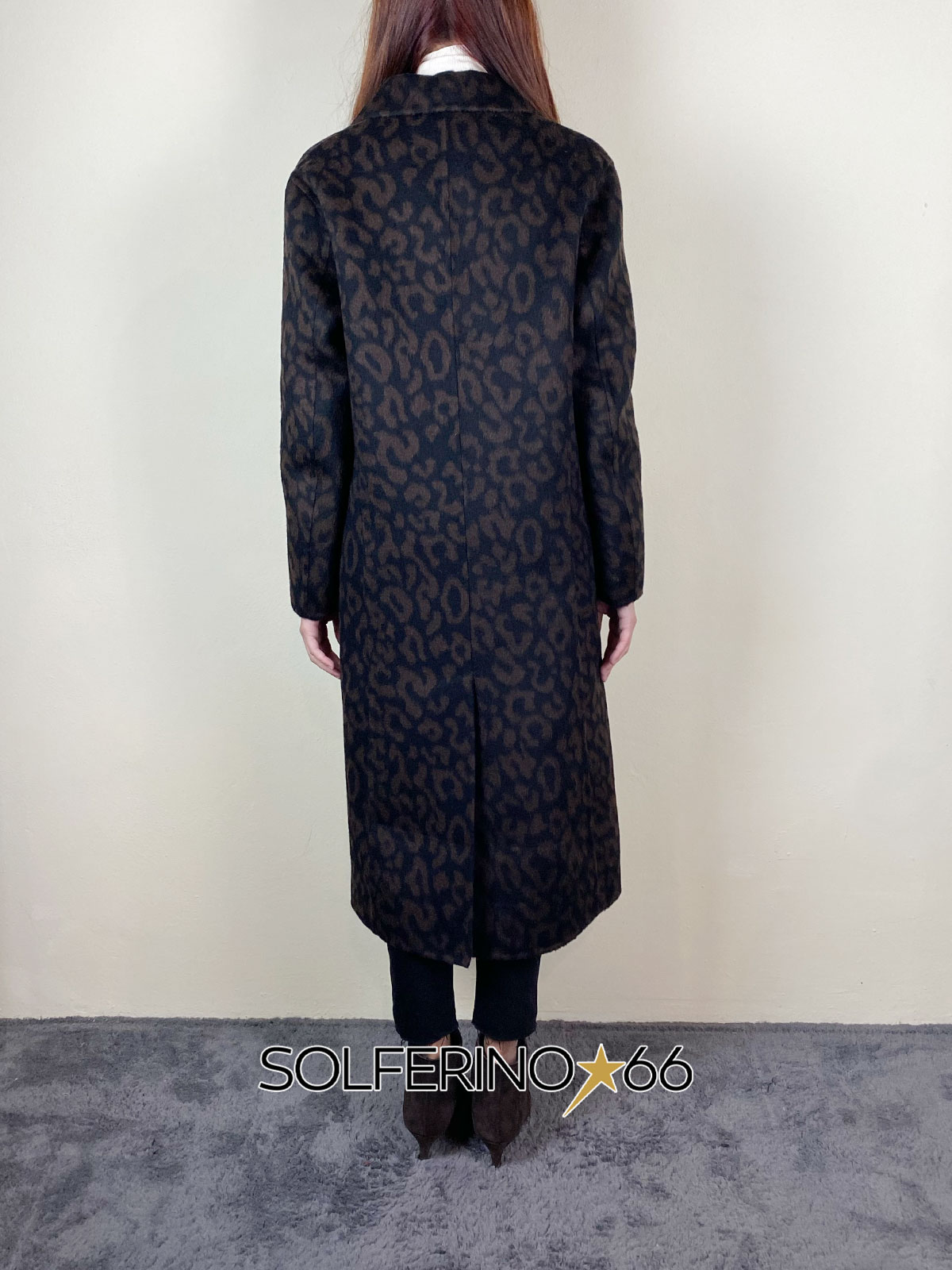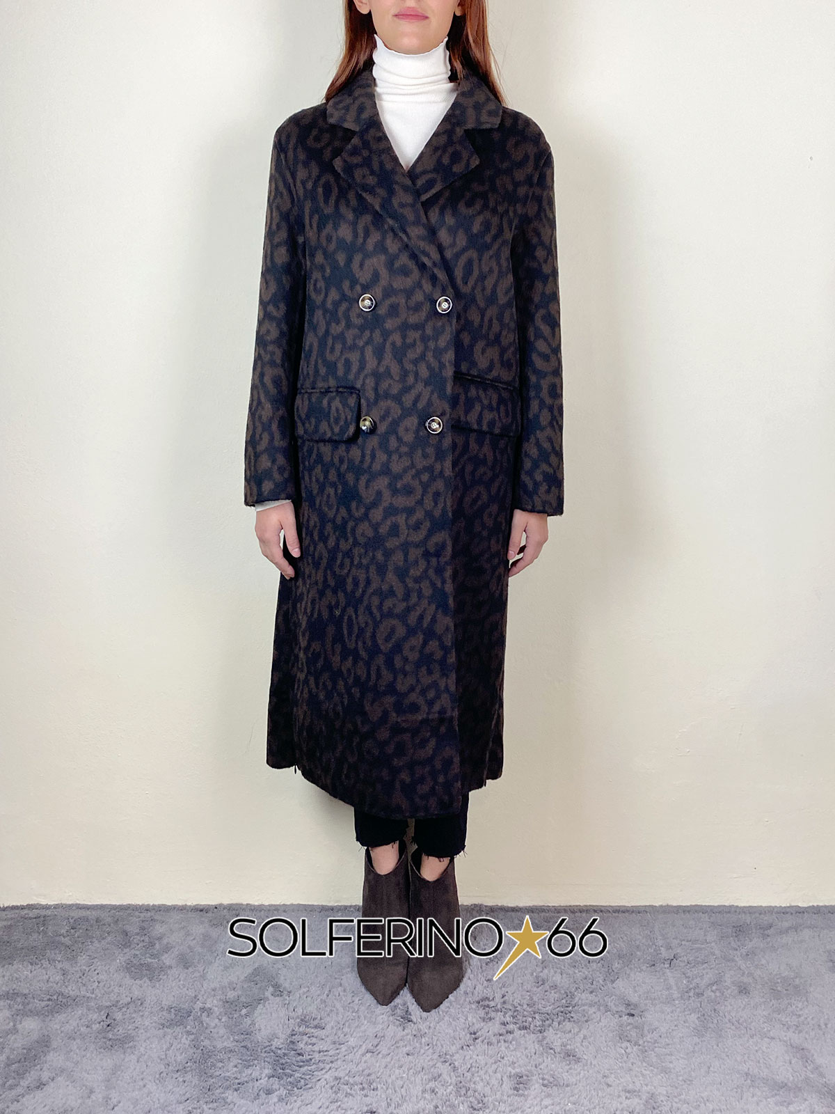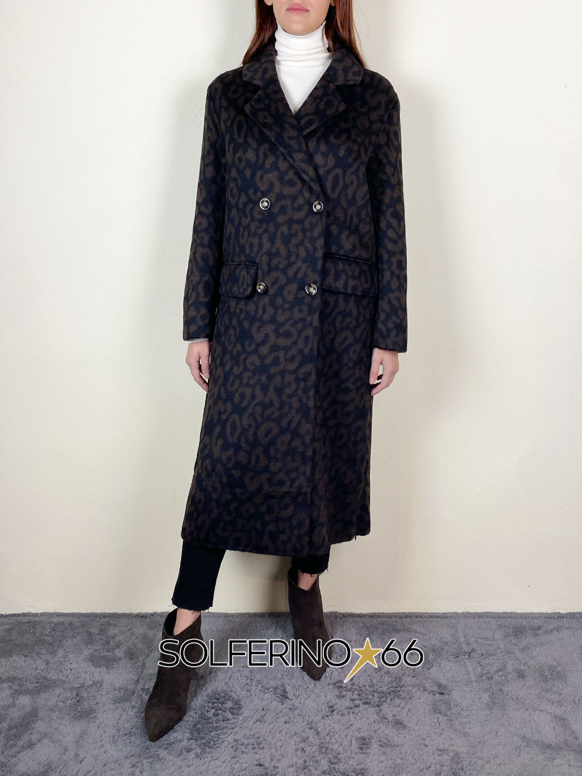 Cappotto lungo doppio petto con chiusura con bottoni oro, tasche con patta applicate e dettaglio spacchi laterali con zip a scomparsa.