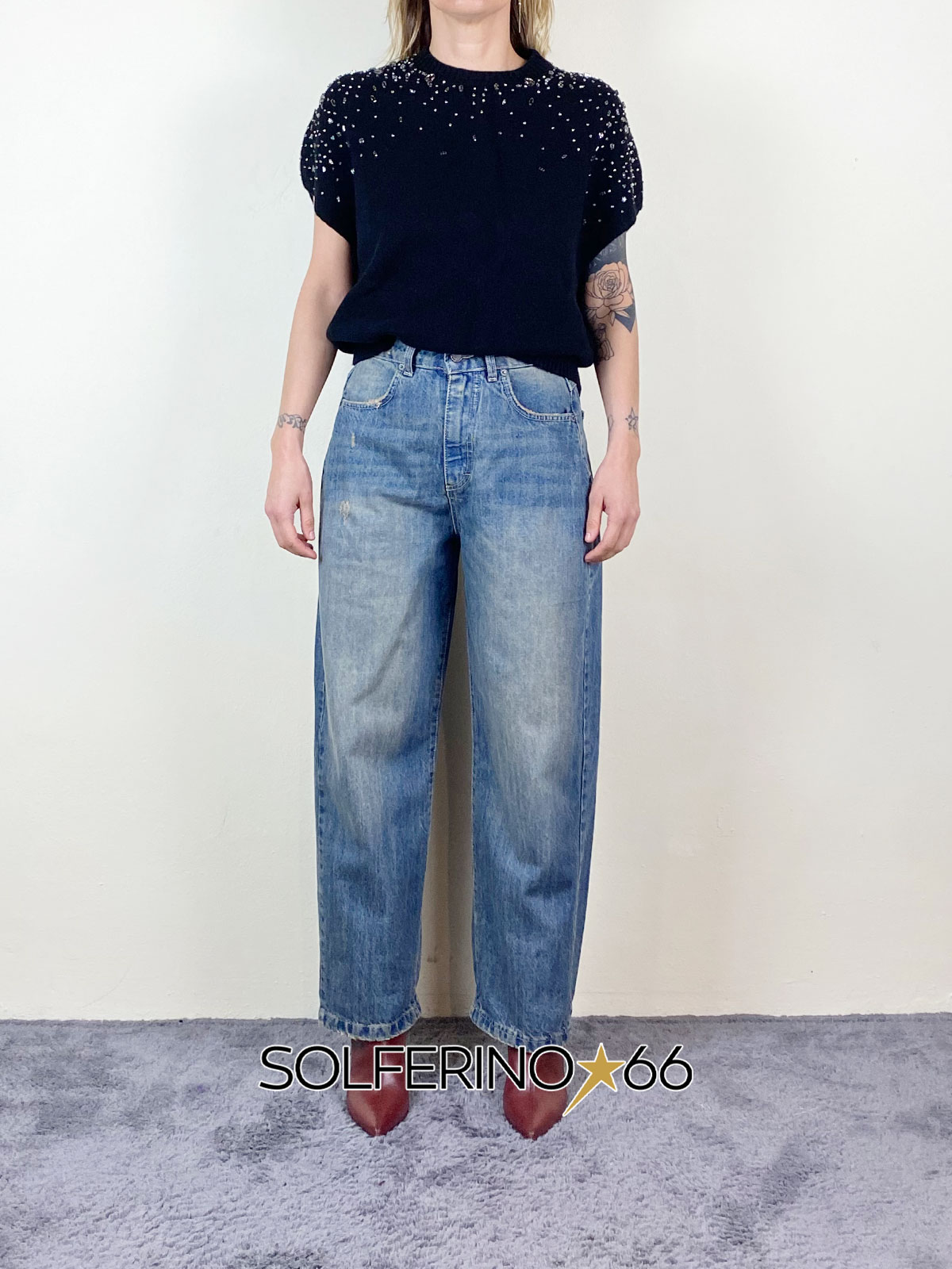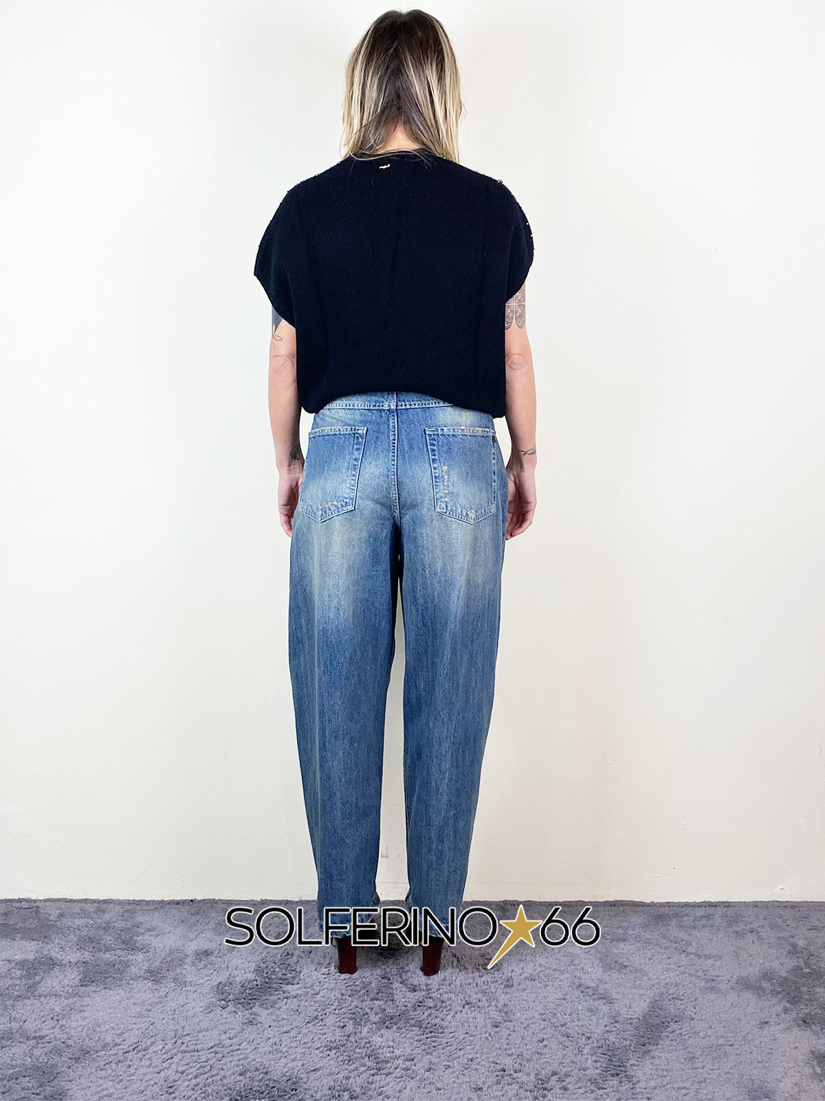 Jeans 5tasche in denim azzurro delave’, modello over con gamba stondata e fondo più stretto..