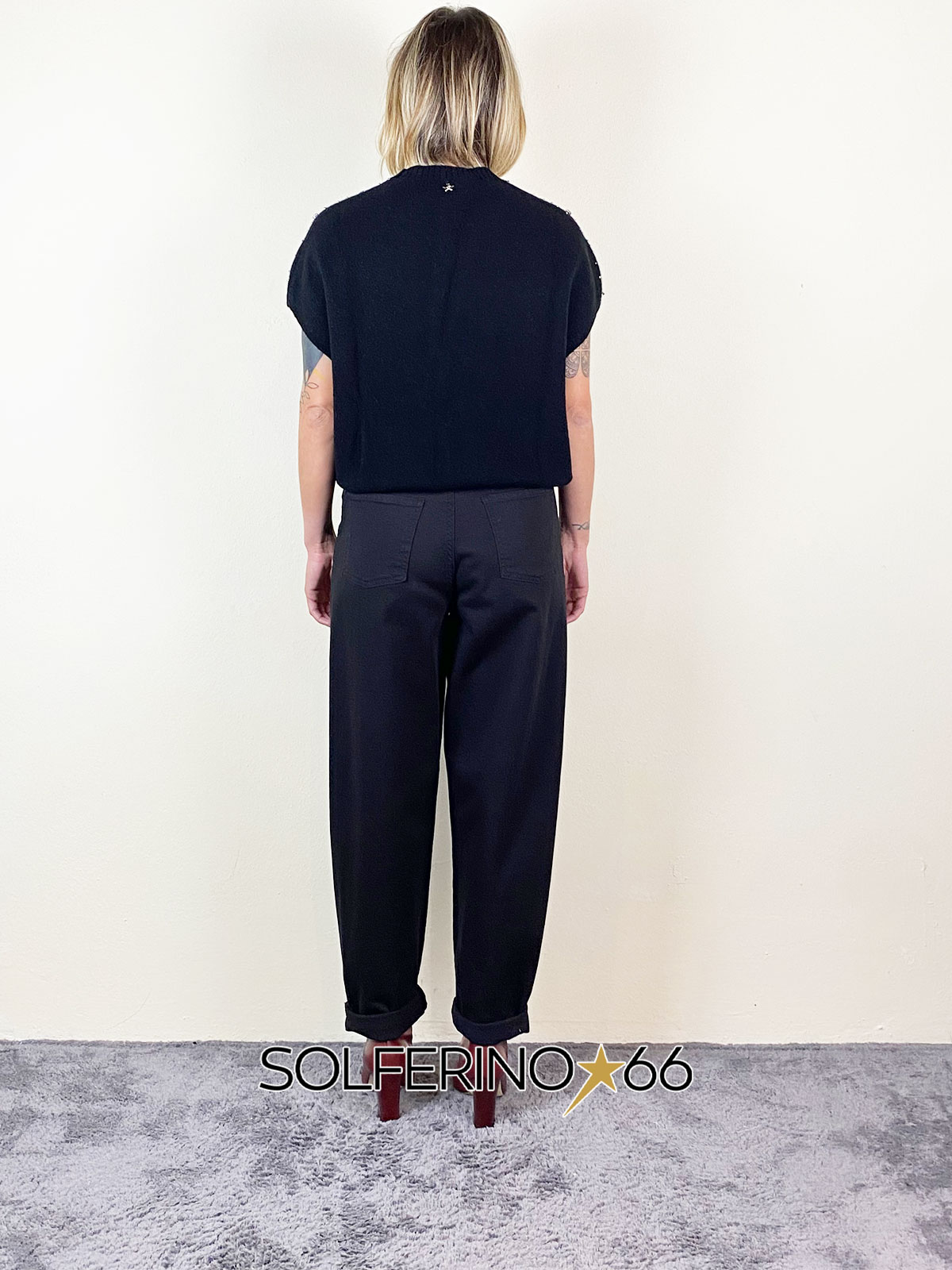 Jeans 5tasche in denim nero, modello a carota con risvolto sul fondo.