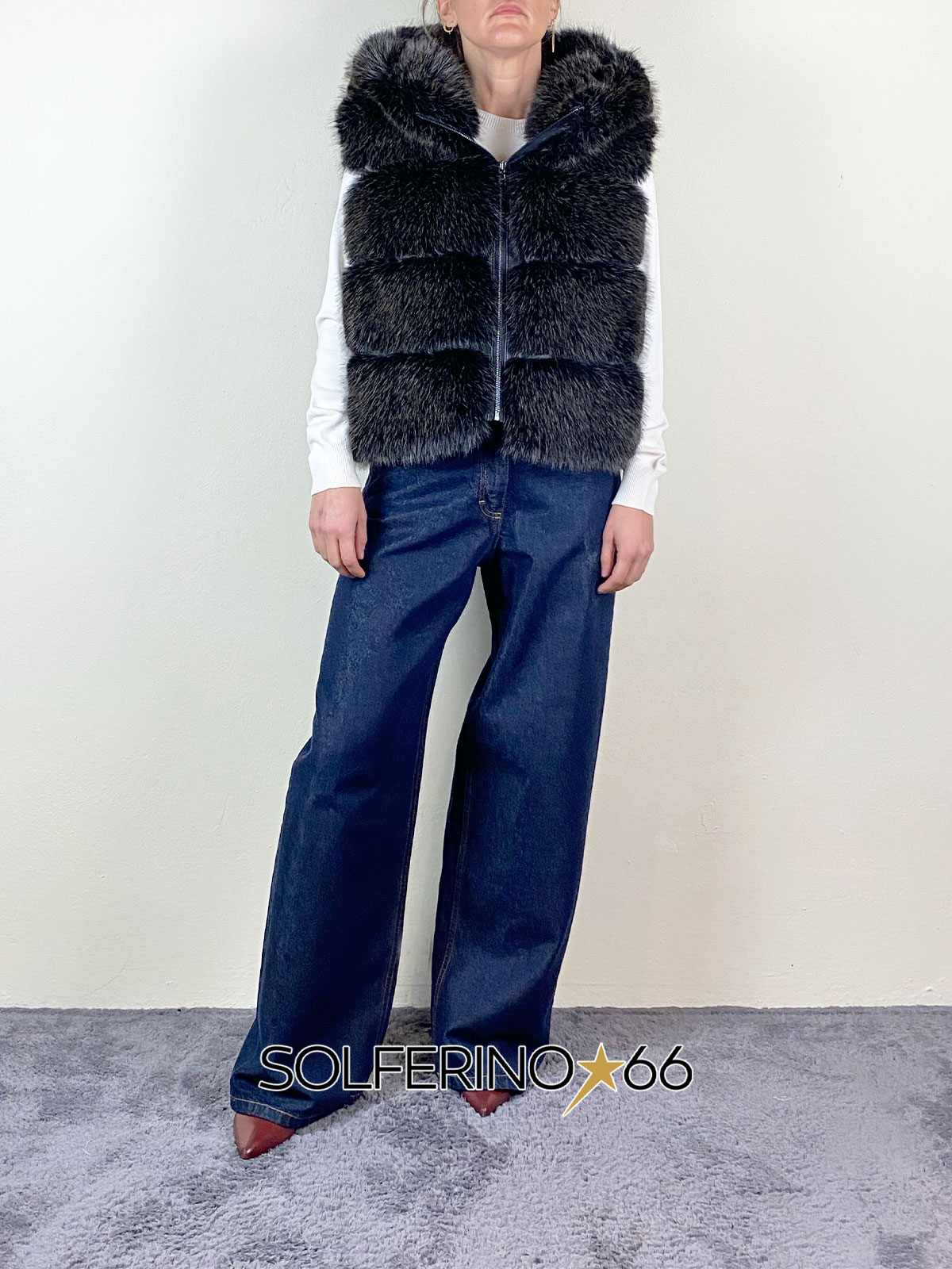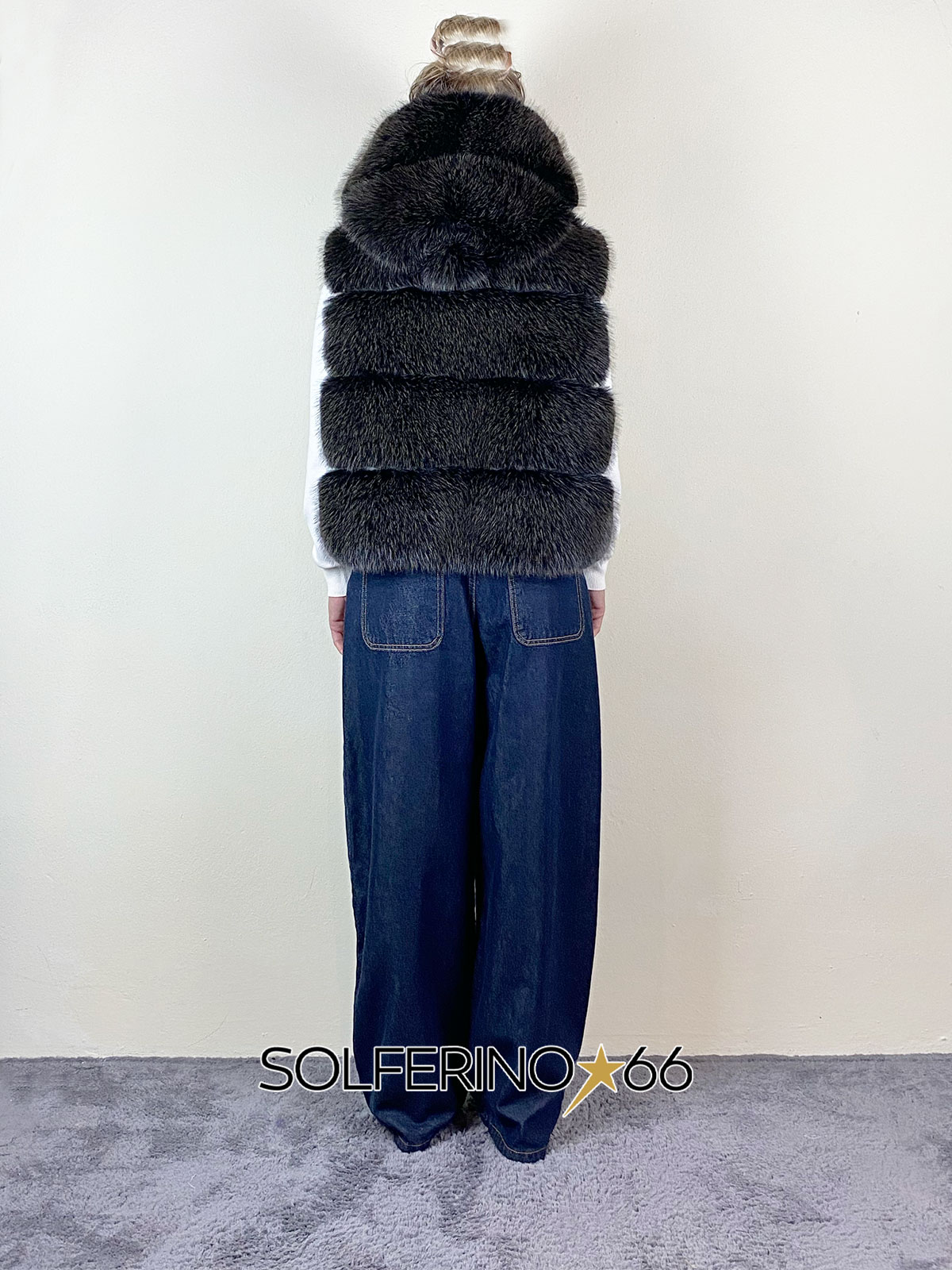 Gilet smanicato in eco pelliccia, modello crop con cappuccio, dettagli in ecopelle e chiusura con zip.