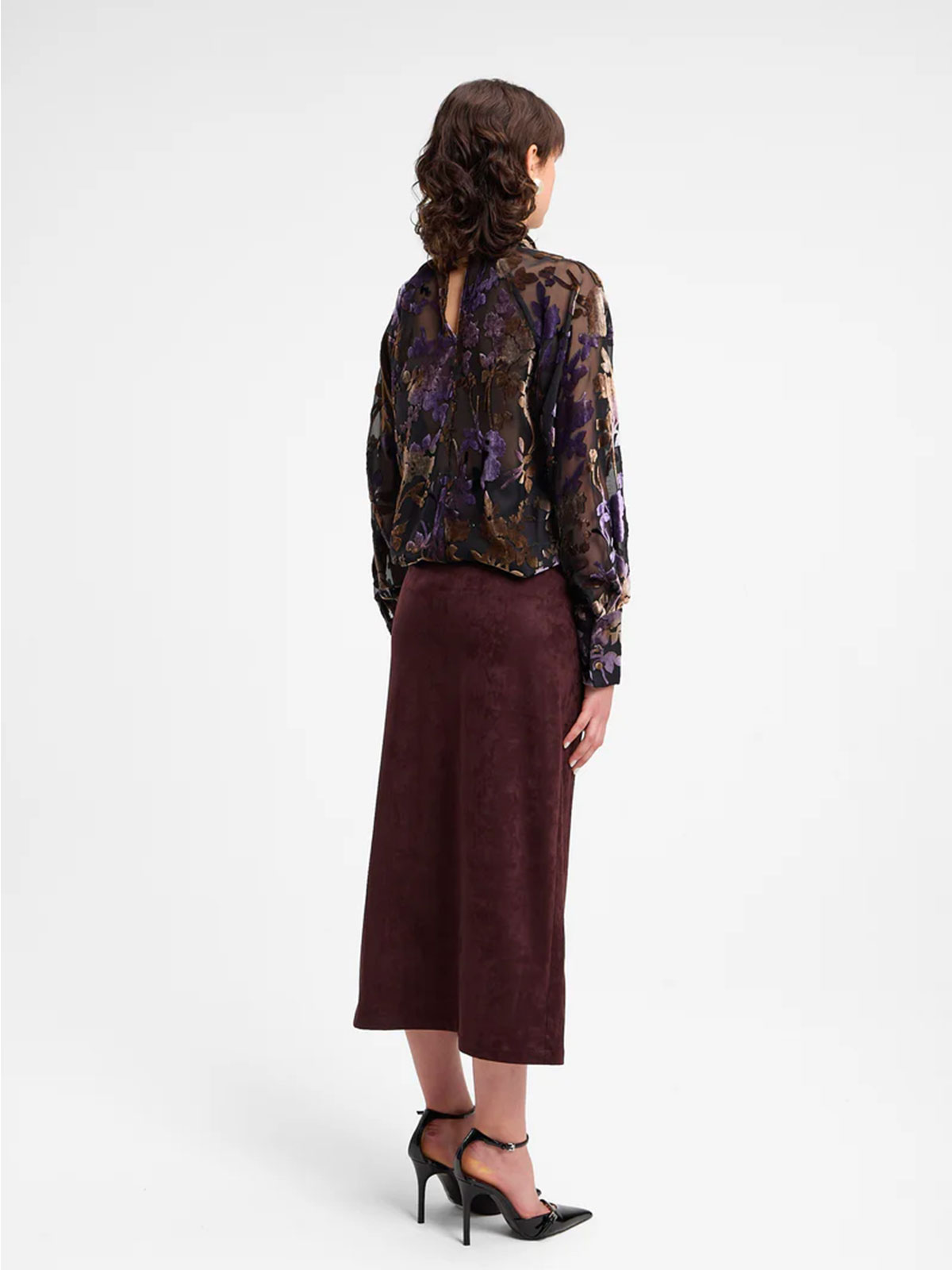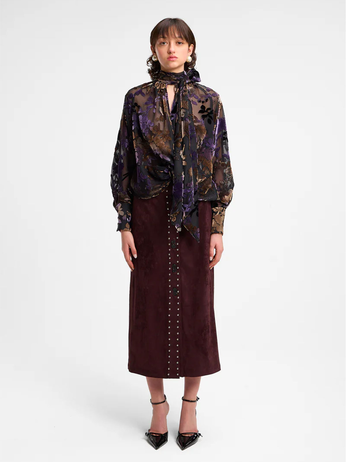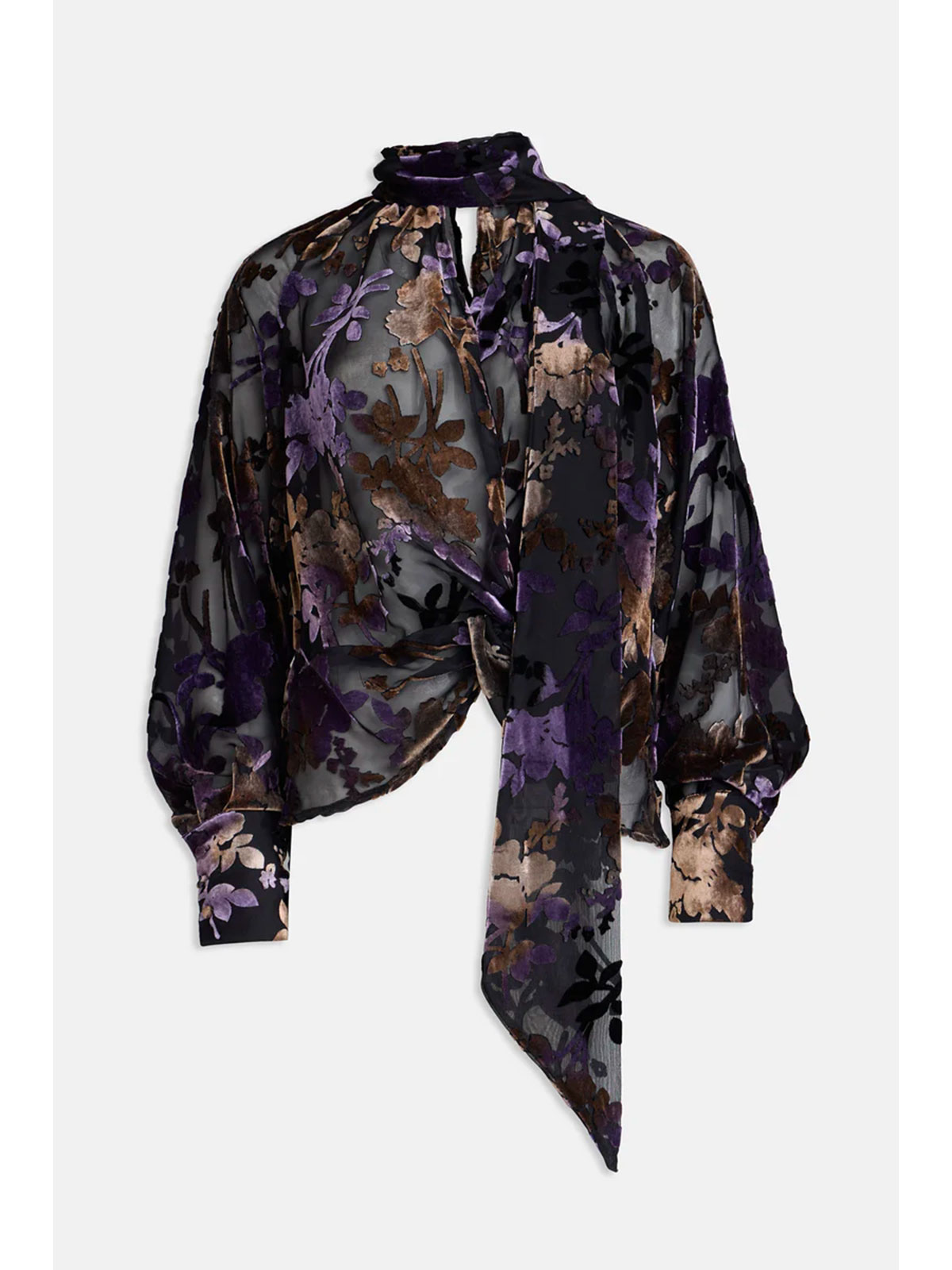 Blusa in devoré con fusciacca sul collo e dettaglio twist sul fondo.