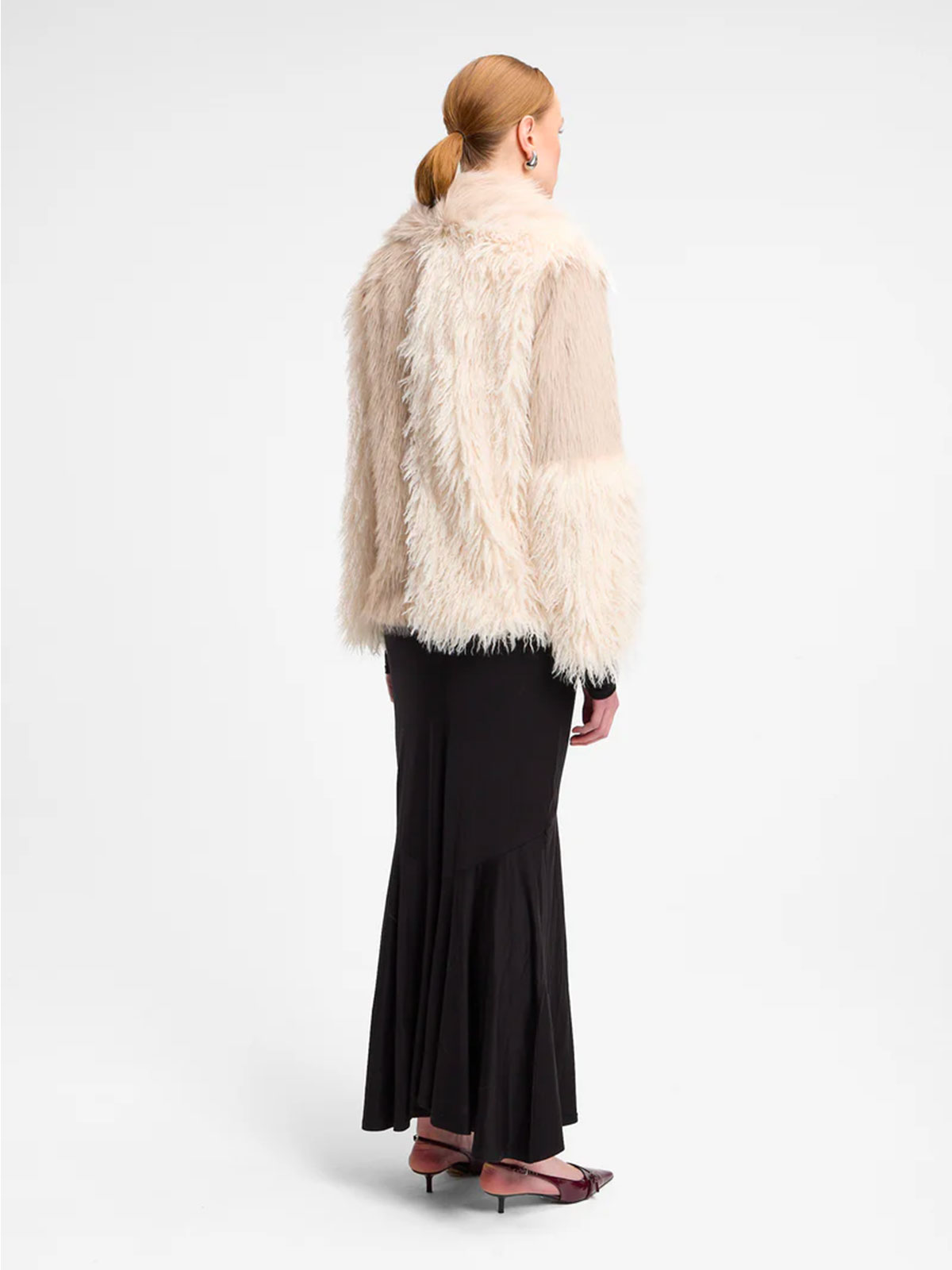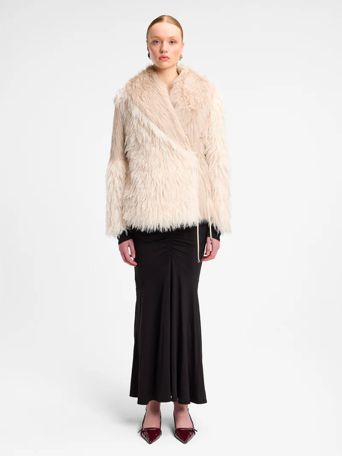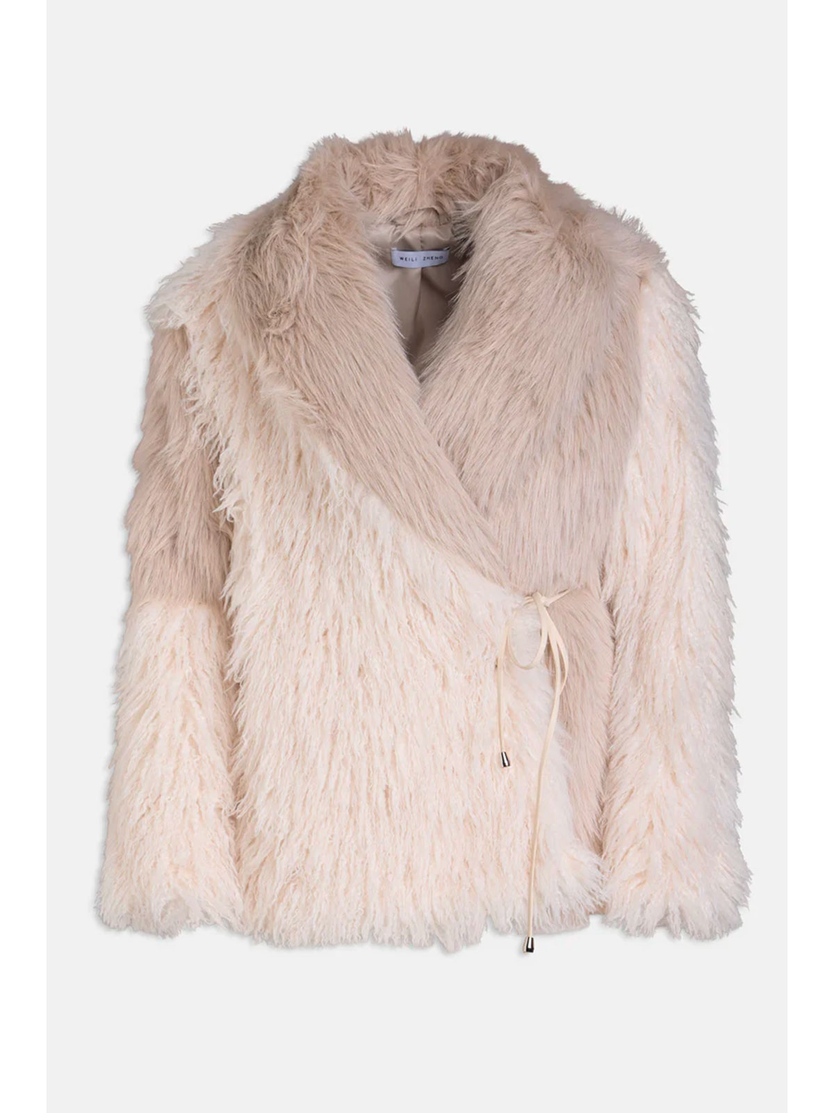 Ecopelliccia con patchwork e chiusura a portafoglio, fit regular, fodera in satin e dettaglio interno con manica in maglia a costine.