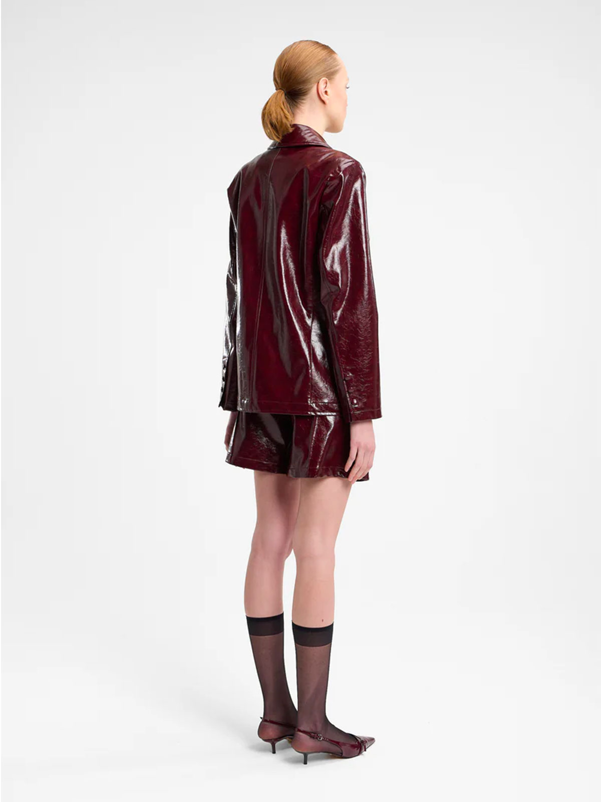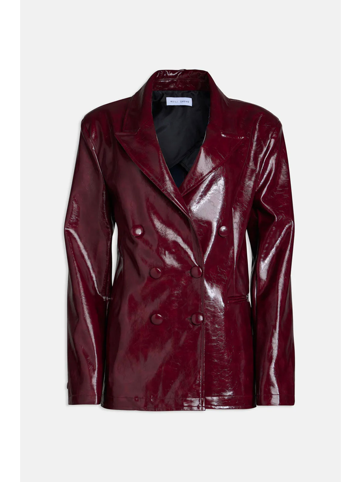 Giacca doppiopetto con collo a lancia in vinile, fit regular e fodera in satin.