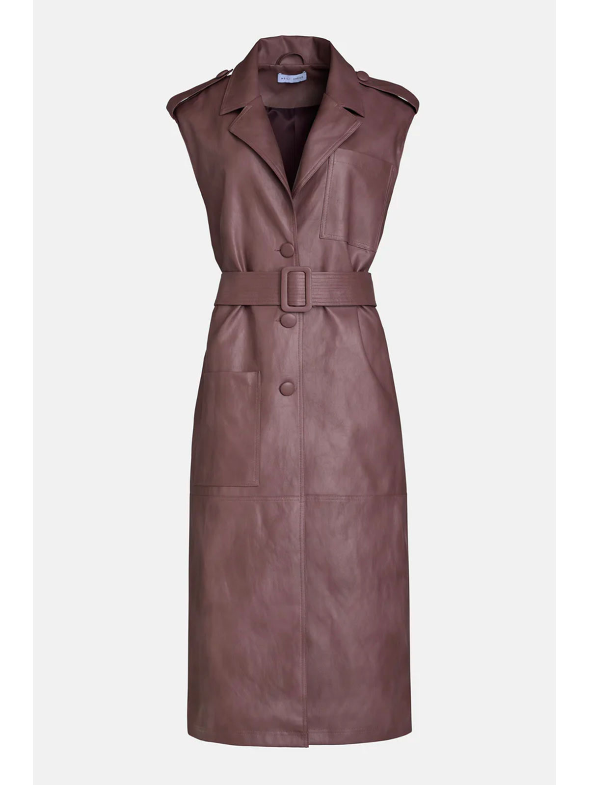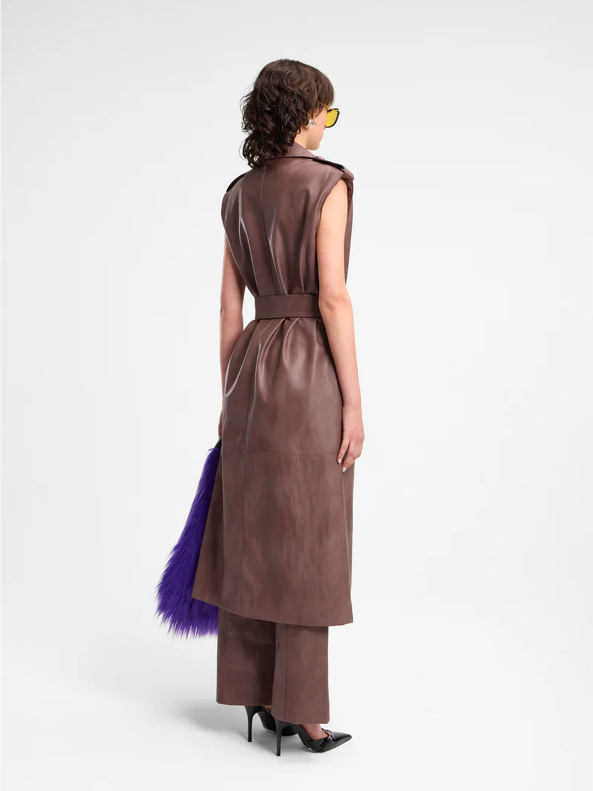 Gilet maxi in simil nappa con revers e cintura in vita.