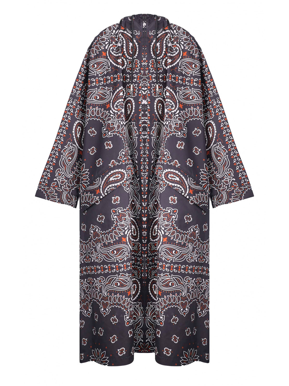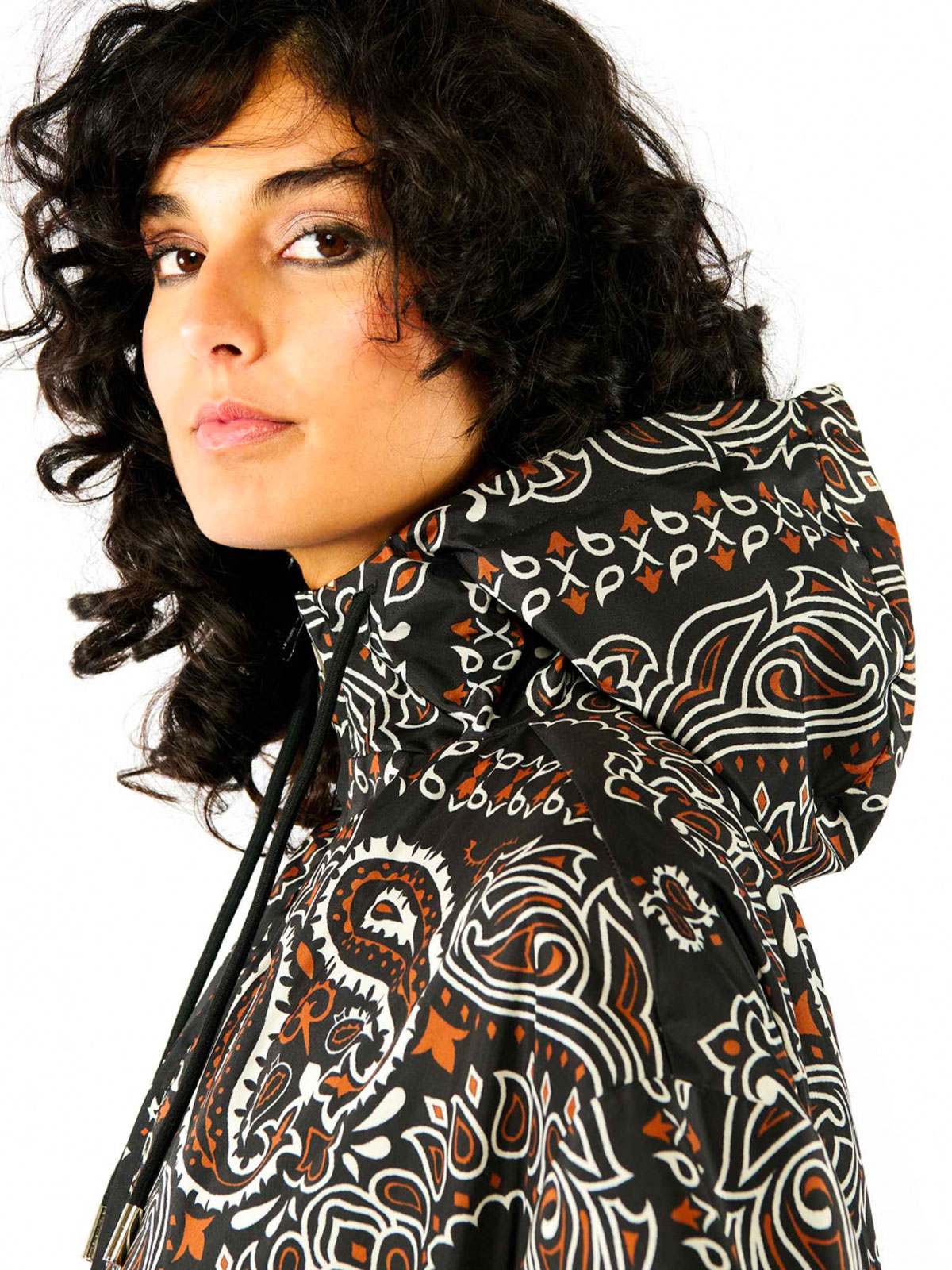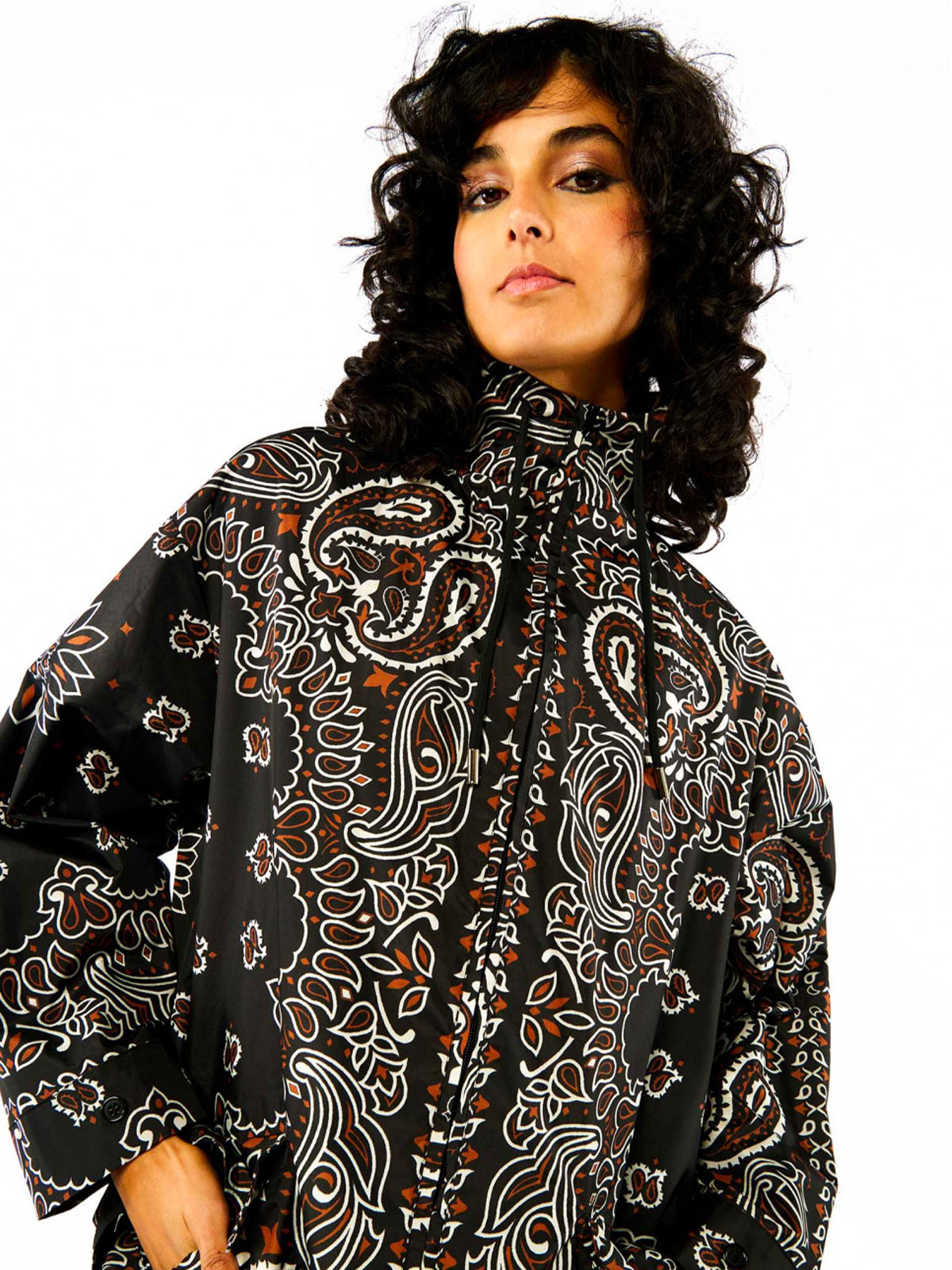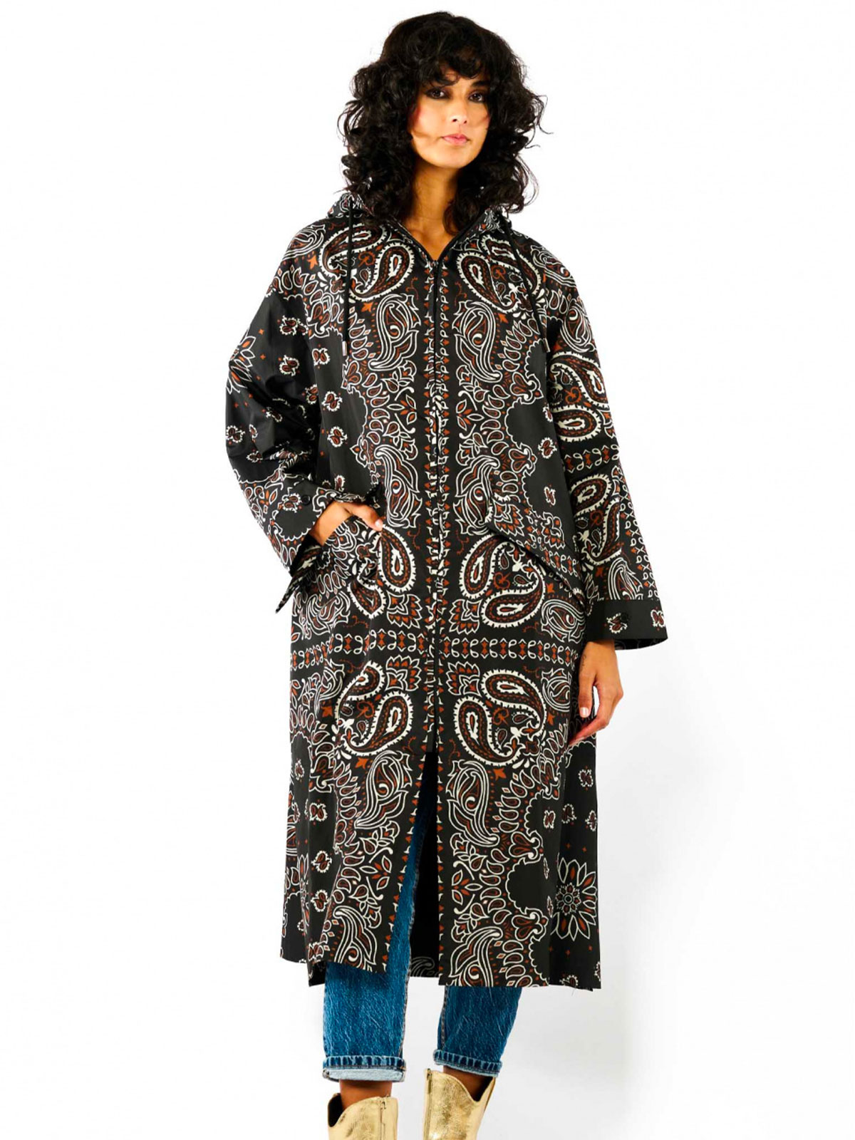 Disponibile in tre colori – nero, blu navy e kaki – offre protezione dalla testa ai piedi grazie al design lungo fino alla caviglia e all’ampio cappuccio. Si chiude con una zip e presenta tasche extra-large con patta e due spacchi su ciascun lato per una perfetta e funzionale libertà di movimento. La versione nera presenta motivi paisley écru e cioccolato.