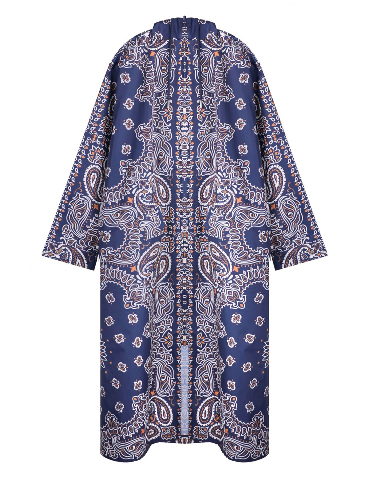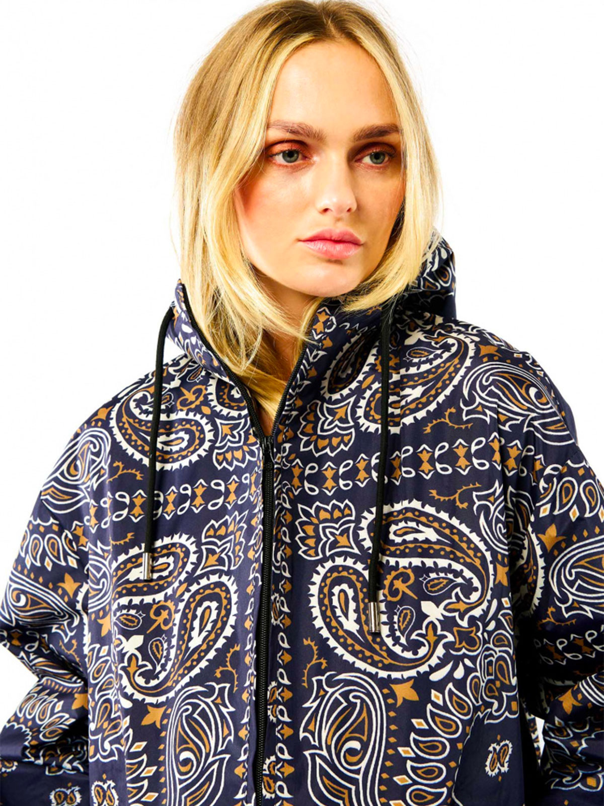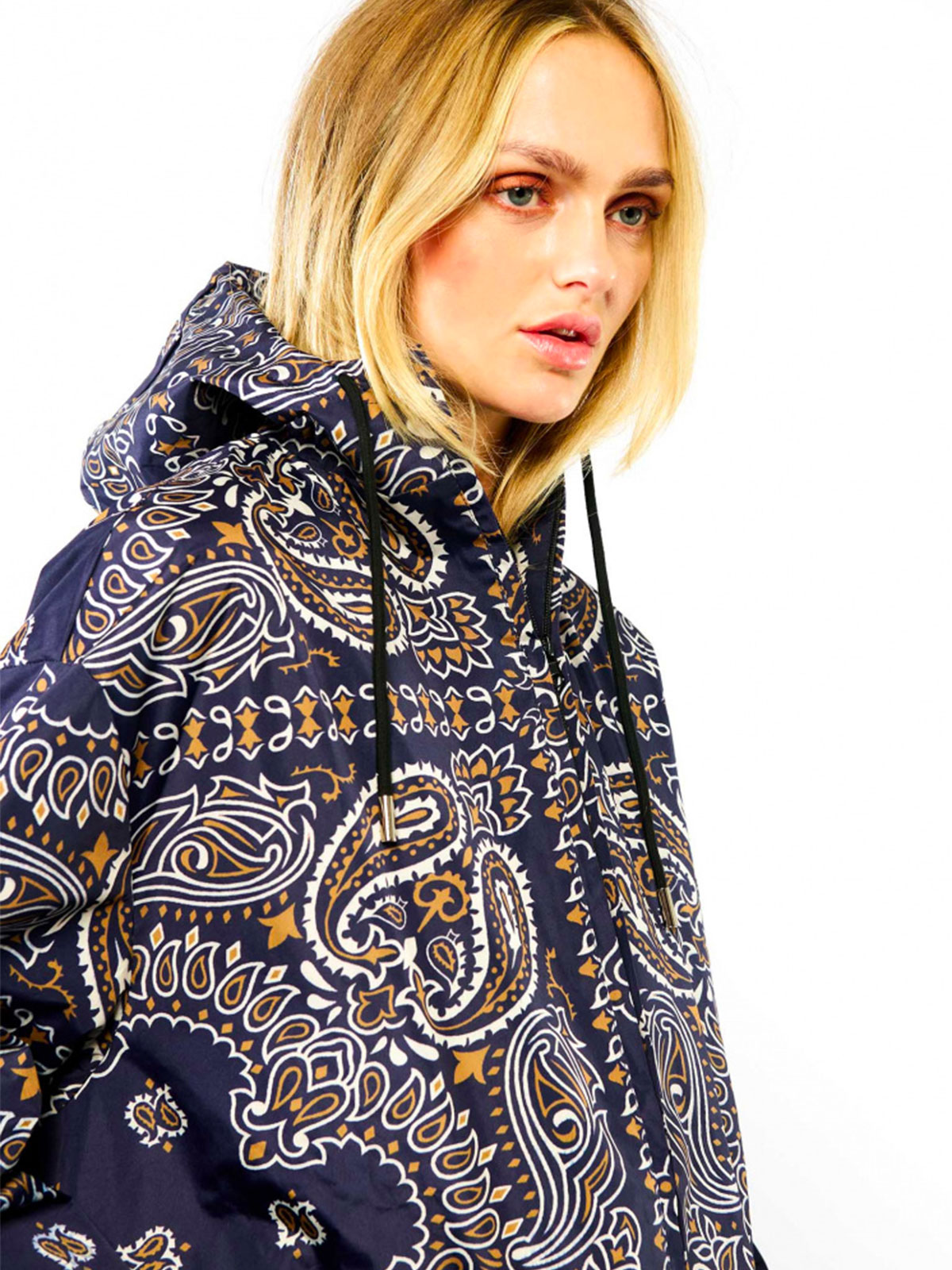 Disponibile in tre colori – nero, blu navy e kaki – offre protezione dalla testa ai piedi grazie al design lungo fino alla caviglia e all’ampio cappuccio. Si chiude con una zip e presenta tasche extra-large con patta e due spacchi su ciascun lato per una perfetta e funzionale libertà di movimento. La versione blu navy presenta motivi paisley écru e caramello.