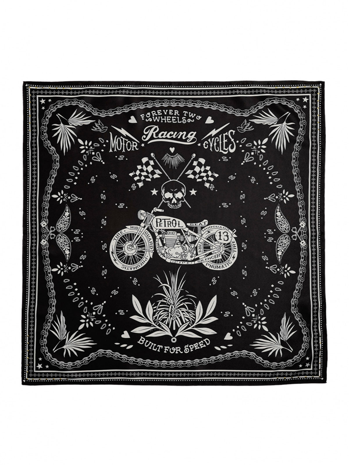 WILD dà nuova vita alla celebre stampa con un tocco biker e ai suoi codici iconici: una motocicletta scintillante, l’inconfondibile teschio e ossa incrociate e le bandiere da corsa in tre colori. Questi elementi forti e distintivi sono addolciti da una struttura femminile che incorpora dettagli affascinanti come fiori, stelle, cuori e motivi paisley, qui su sfondo nero. Versatile, può essere indossata come sciarpa o pareo, a seconda del formato. Annodala al collo, in vita, come turbante o anche come accessorio chic sulla tua borsa.