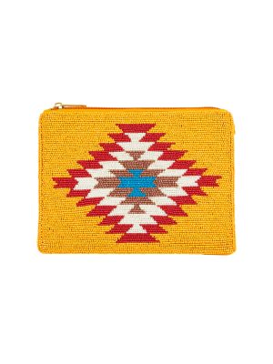 Questa custodia con cerniera è completamente in rilievo. Per la versione ocra lo sfondo è ricamato con perline gialle con motivi nei toni caramello, ocra e mattone e un centro turchese. Ci piace l’idea che questa pochette valorizzi con eleganza jeans o maglieria.