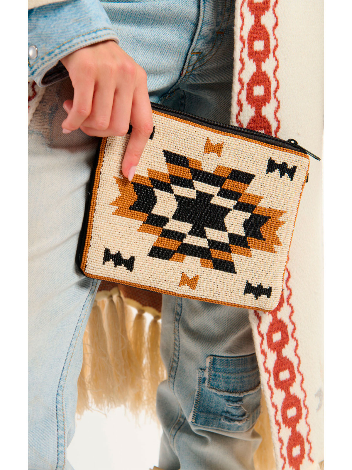 Questa custodia con cerniera è completamente in rilievo. Per la versione nera, lo sfondo è ricamato con perline ocra con motivi nei toni caramello e nero. Ci piace l’idea che questa pochette valorizzi con eleganza jeans o maglieria.