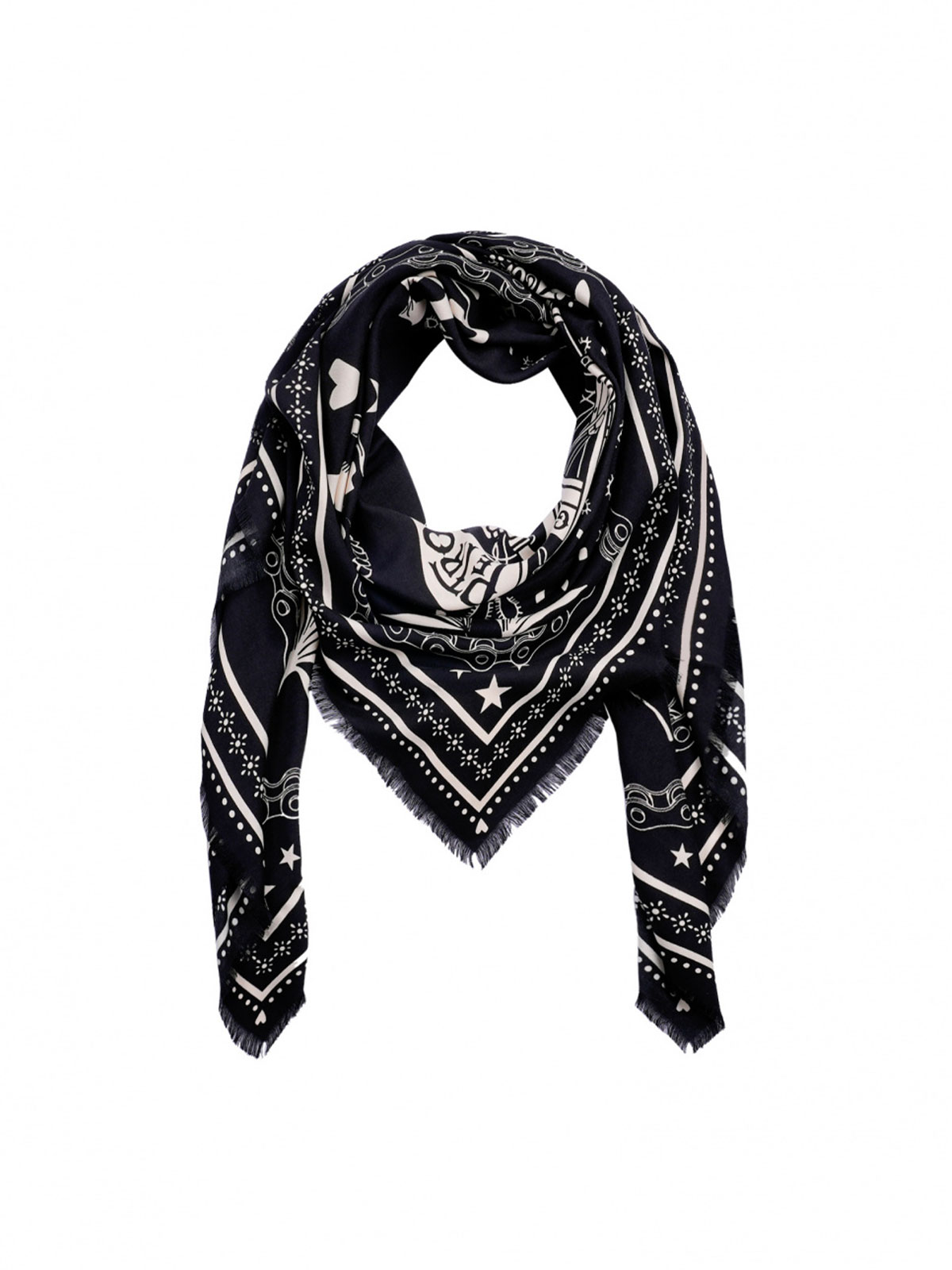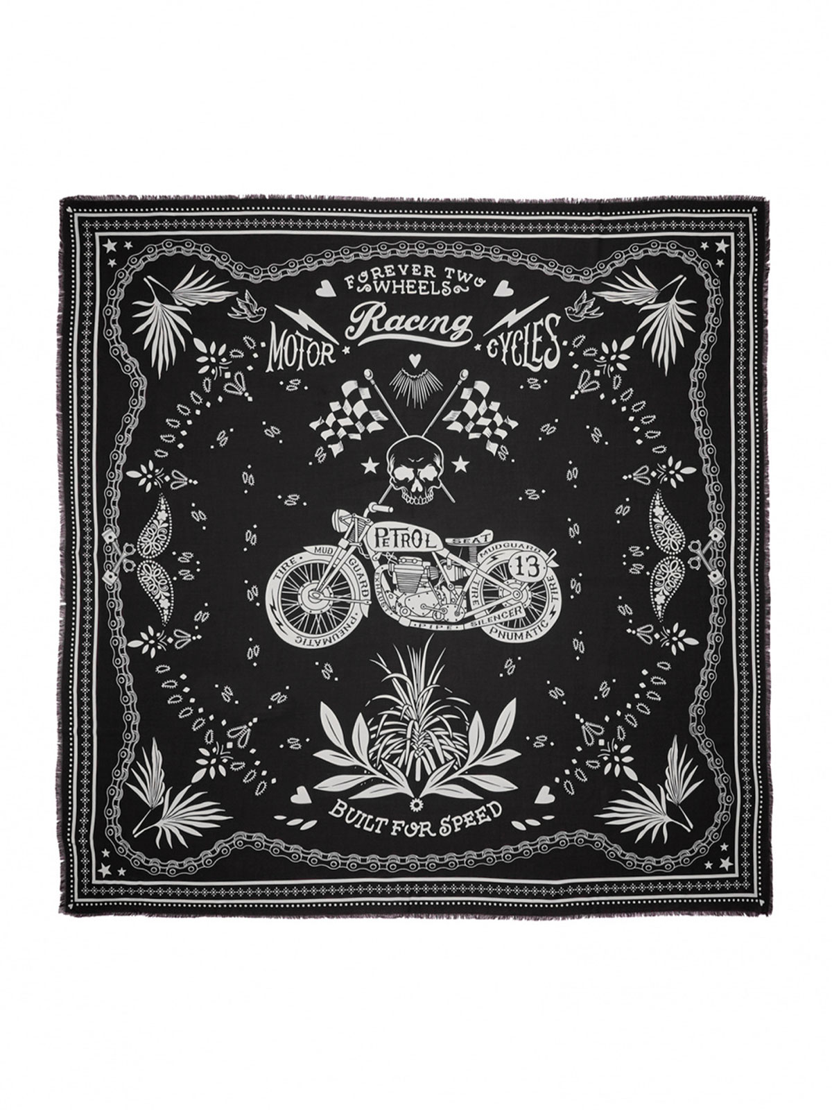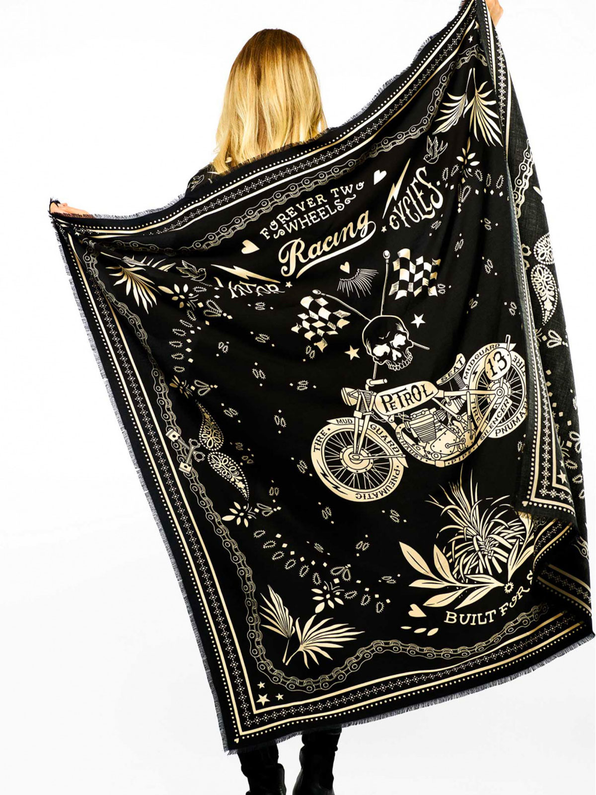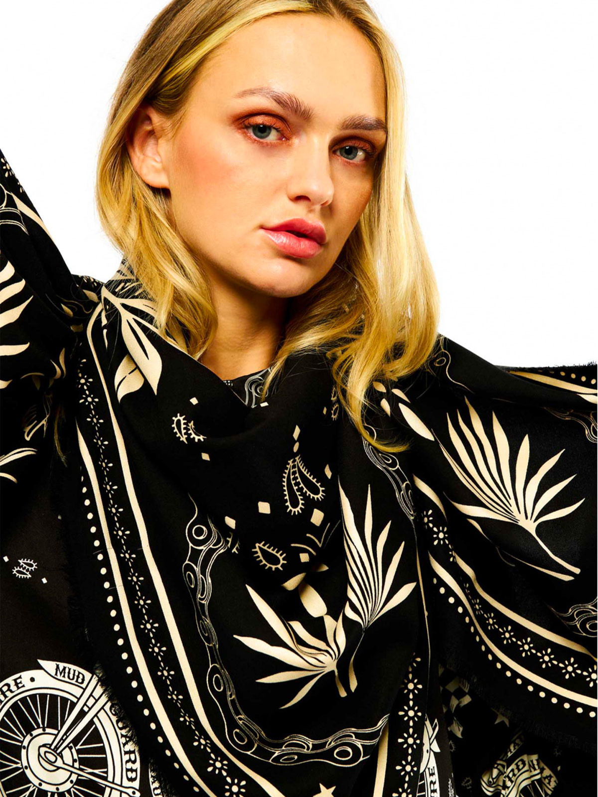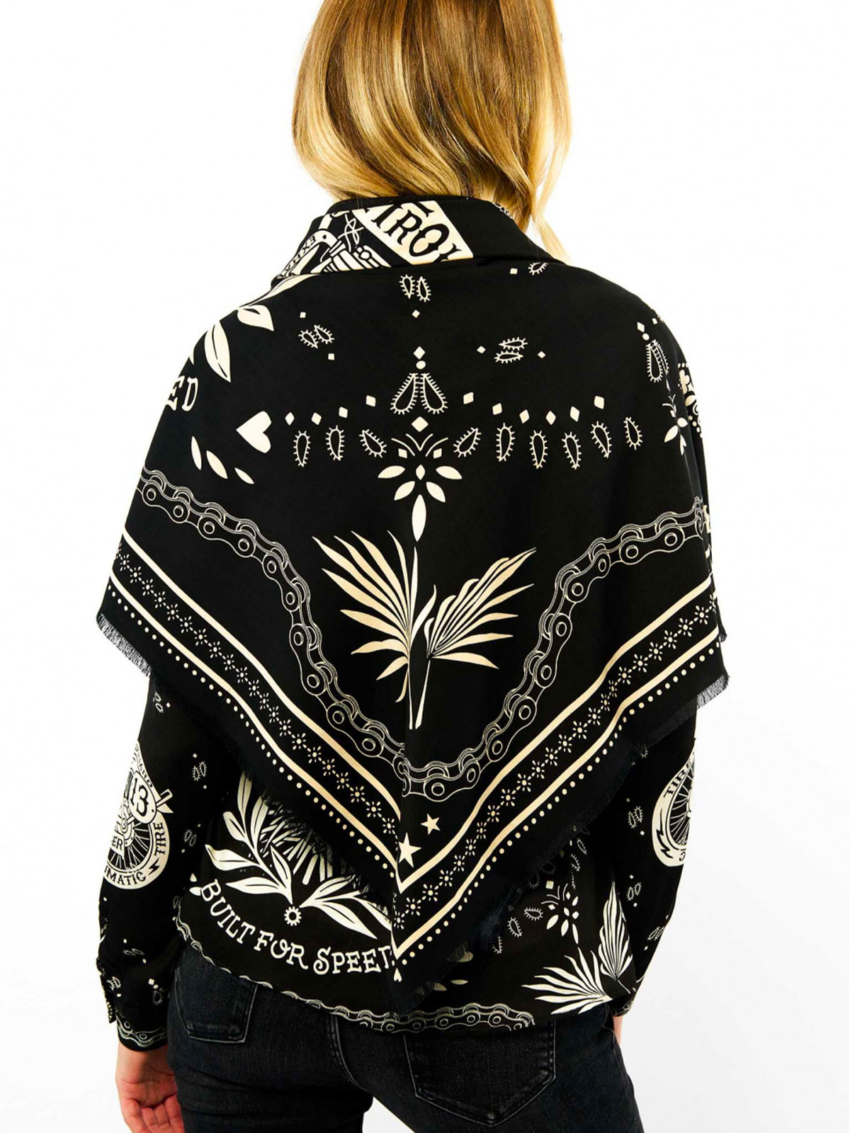 WILD dà nuova vita alla celebre stampa con un tocco biker e ai suoi codici iconici: una motocicletta abbagliante, l’inconfondibile teschio e ossa incrociate e le bandiere da corsa in tre colori. Questi elementi forti e distintivi sono addolciti da una struttura femminile che incorpora dettagli affascinanti come fiori, stelle, cuori e motivi paisley, qui su sfondo nero. Versatile, può essere indossato come sciarpa o pareo, a seconda del formato. Annodalo al collo, in vita, come turbante o anche come accessorio chic sulla tua borsa.