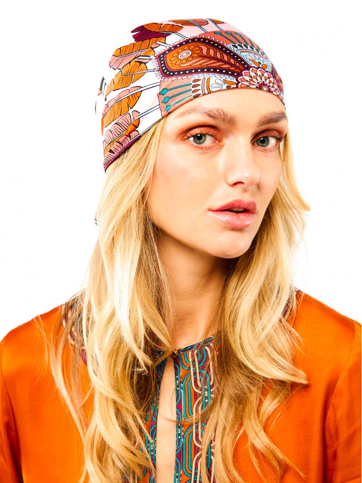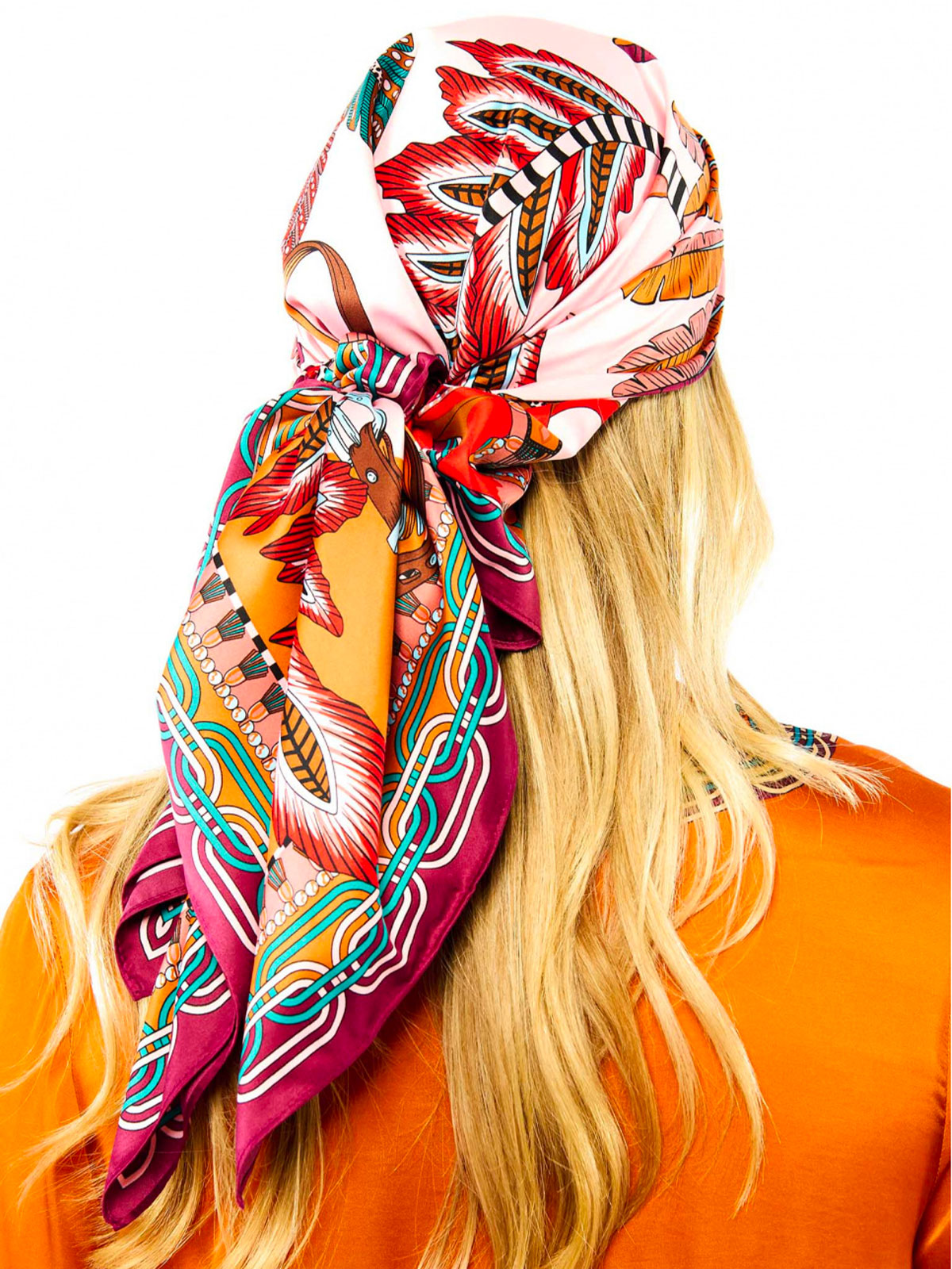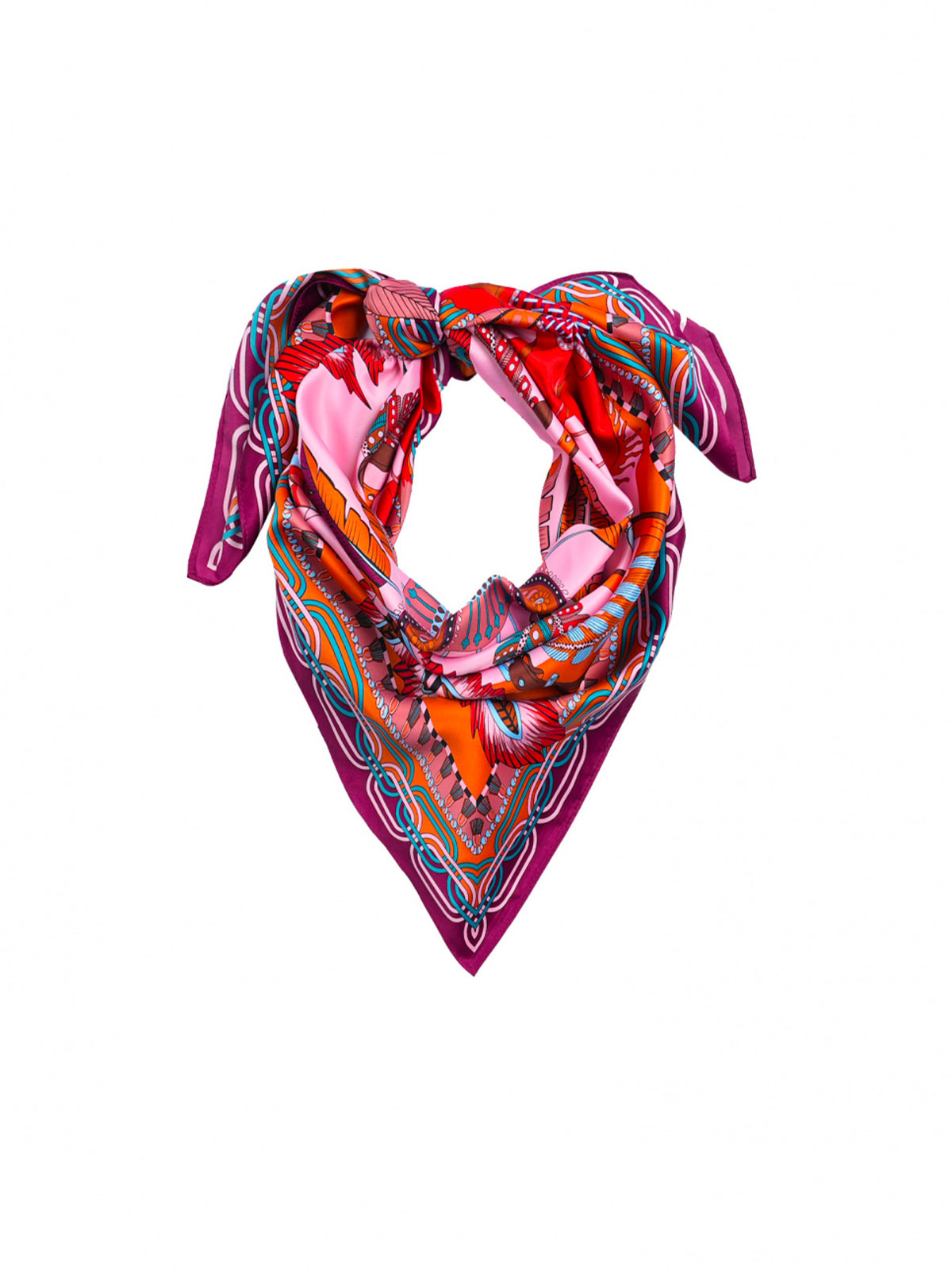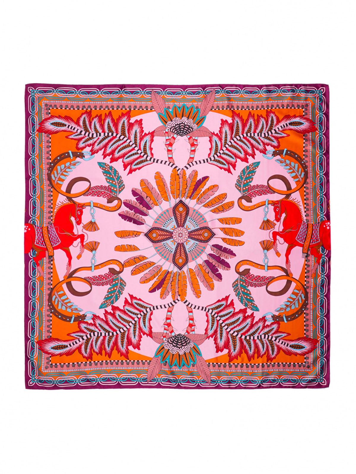 Articolata attorno a uno straordinario disco solare centrale, una vegetazione prodigiosa ricopre la sciarpa con le sue foglie multicolori. Grafiche ricche ed evocative ed elementi equestri come nappe e una cavezza completano questa stampa unica. Disponibile in tre colori, lo sfondo è rosa pallido e autunnale, con accenti di arancione mattone, rosso, vinaccia e turchese. Versatile, può essere indossata come sciarpa o pareo, a seconda della taglia. Annodala al collo, in vita, come turbante o anche come accessorio chic sulla tua borsa.
