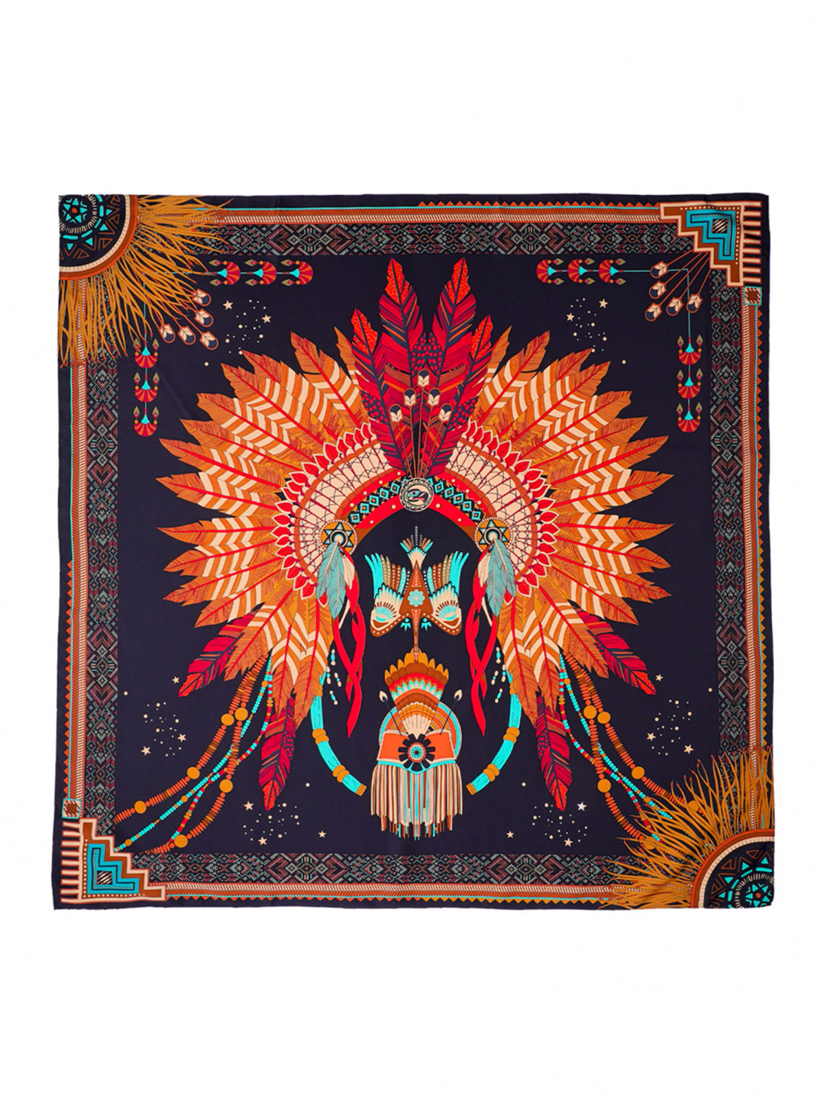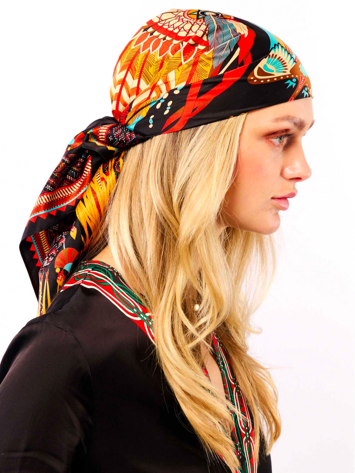 Quest’inverno, la stampa Nouveau Western è impreziosita da un sontuoso e imponente copricapo indiano al centro, impreziosito da simboli tribali su ogni angolo della sciarpa. Elemento fedele e ricorrente del DNA WILD, i motivi dei nostri bracciali brasiliani incorniciano elegantemente la sciarpa, fondendosi con i simboli emblematici del brand, come stelle, piume e bordi distintivi. Disponibile in tre colori, la versione nera presenta motivi color caramello, rosso, bianco, turchese e nero. Versatile, può essere indossata come sciarpa o pareo, a seconda del formato. Annodala al collo, in vita, come turbante o anche come accessorio chic sulla tua borsa.