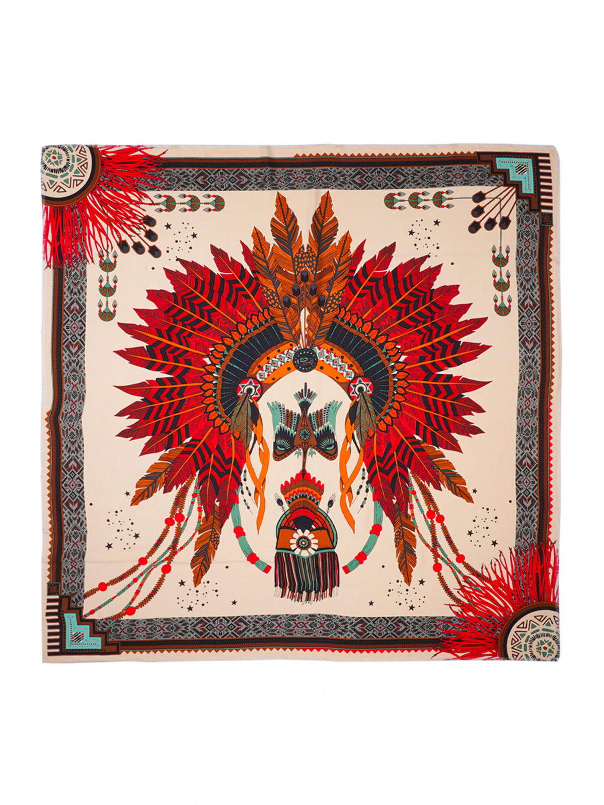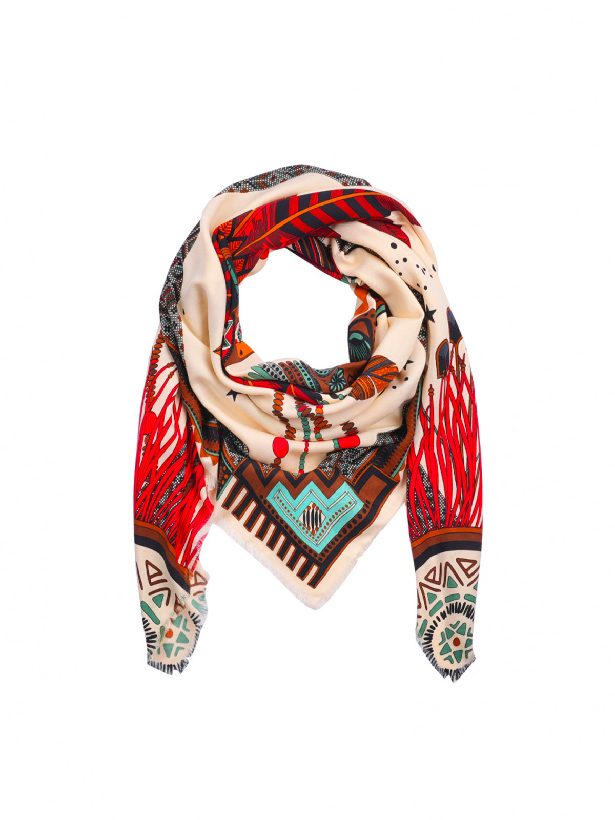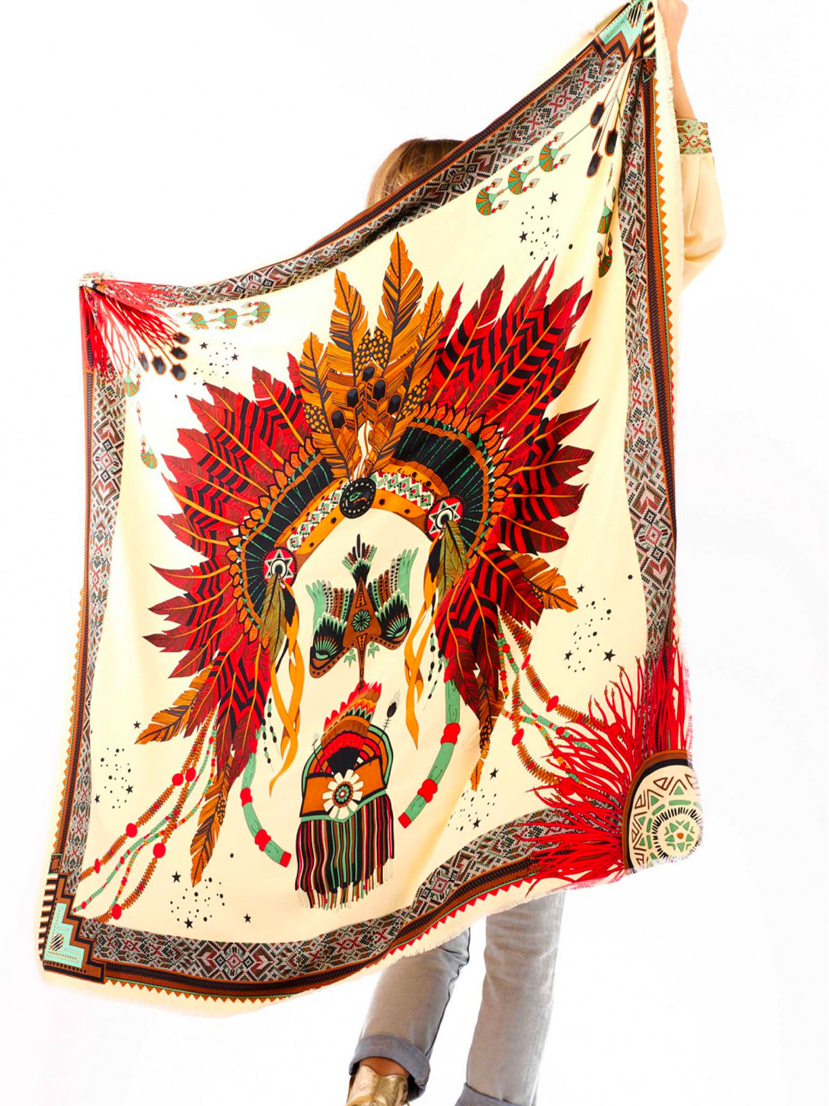 Quest’inverno, la stampa Nouveau Western è impreziosita da un sontuoso e imponente copricapo indiano al centro, impreziosito da simboli tribali su ogni angolo della sciarpa. Elemento fedele e ricorrente del DNA WILD, i motivi dei nostri bracciali brasiliani incorniciano elegantemente la sciarpa. Si fondono con i simboli emblematici del marchio, come stelle, piume e bordi distintivi. Disponibile in tre colori, la versione beige presenta motivi rossi, kaki, neri e fulvi. Versatile, può essere indossata come sciarpa o pareo, a seconda del formato. Annodala al collo, in vita, come turbante o anche come accessorio chic sulla tua borsa.