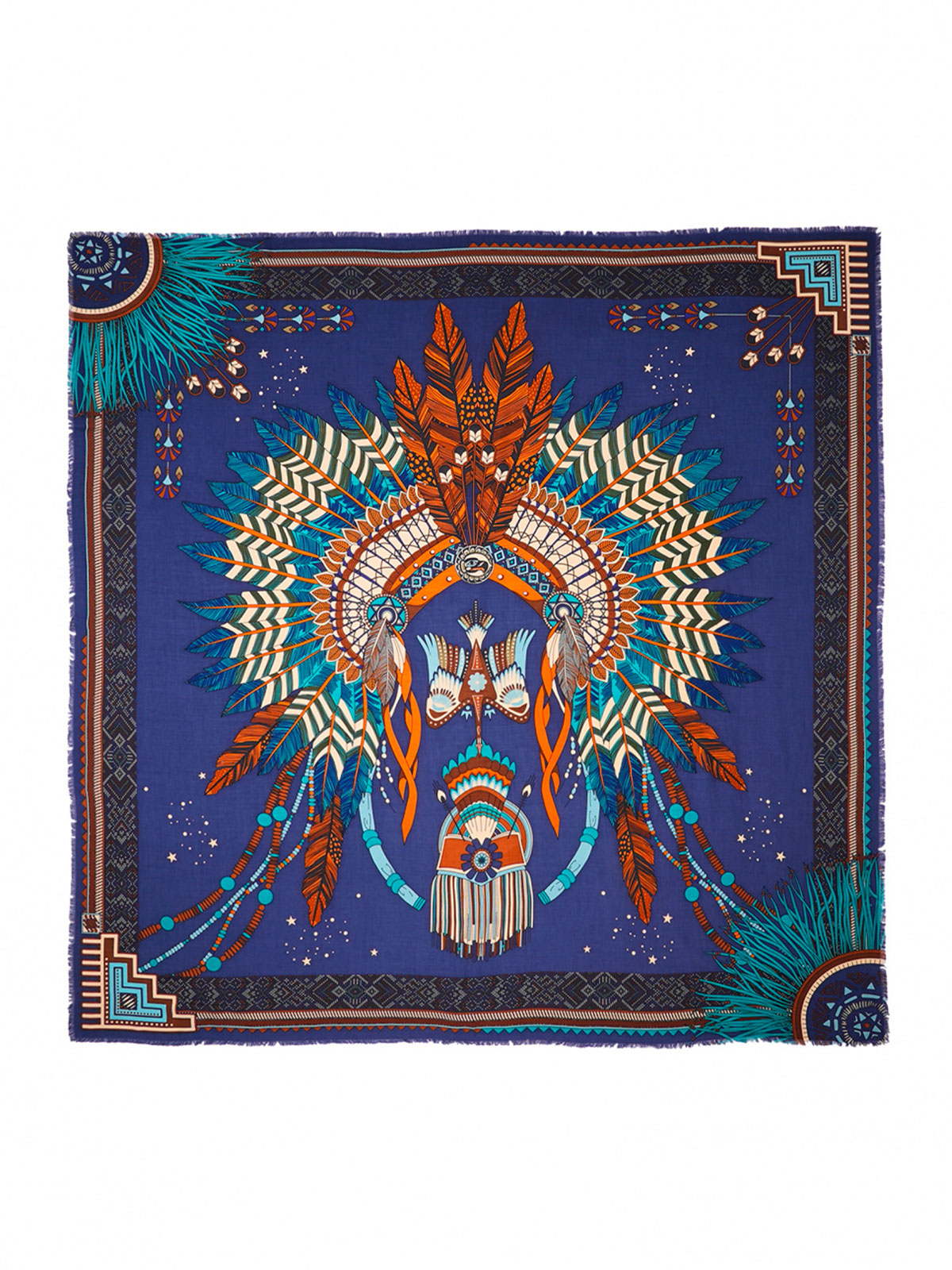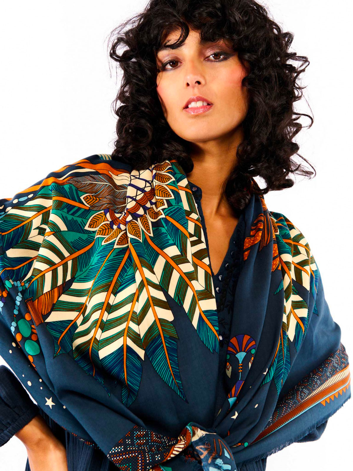 Quest’inverno, la stampa Nouveau Western è impreziosita da un sontuoso e imponente copricapo indiano al centro, impreziosito da simboli tribali su ogni angolo della sciarpa. Elemento fedele e ricorrente del DNA WILD, i motivi dei nostri bracciali brasiliani incorniciano elegantemente la sciarpa. Si fondono con i simboli emblematici del marchio, come stelle, piume e bordi distintivi. Disponibile in tre colori, la versione blu presenta motivi turchese, caramello, marrone, beige avorio e kaki. Versatile, può essere indossato come sciarpa o pareo, a seconda del formato. Annodalo al collo, in vita, come turbante o anche come accessorio chic sulla tua borsa.