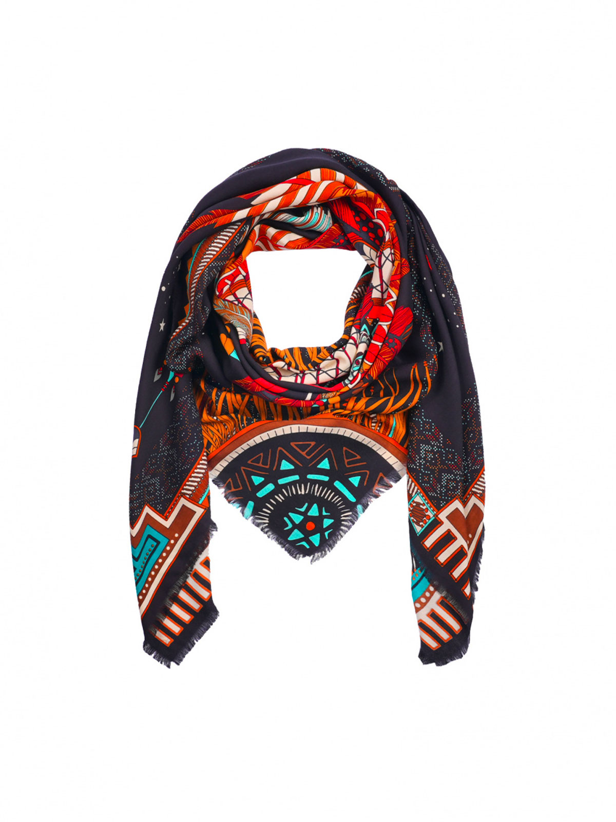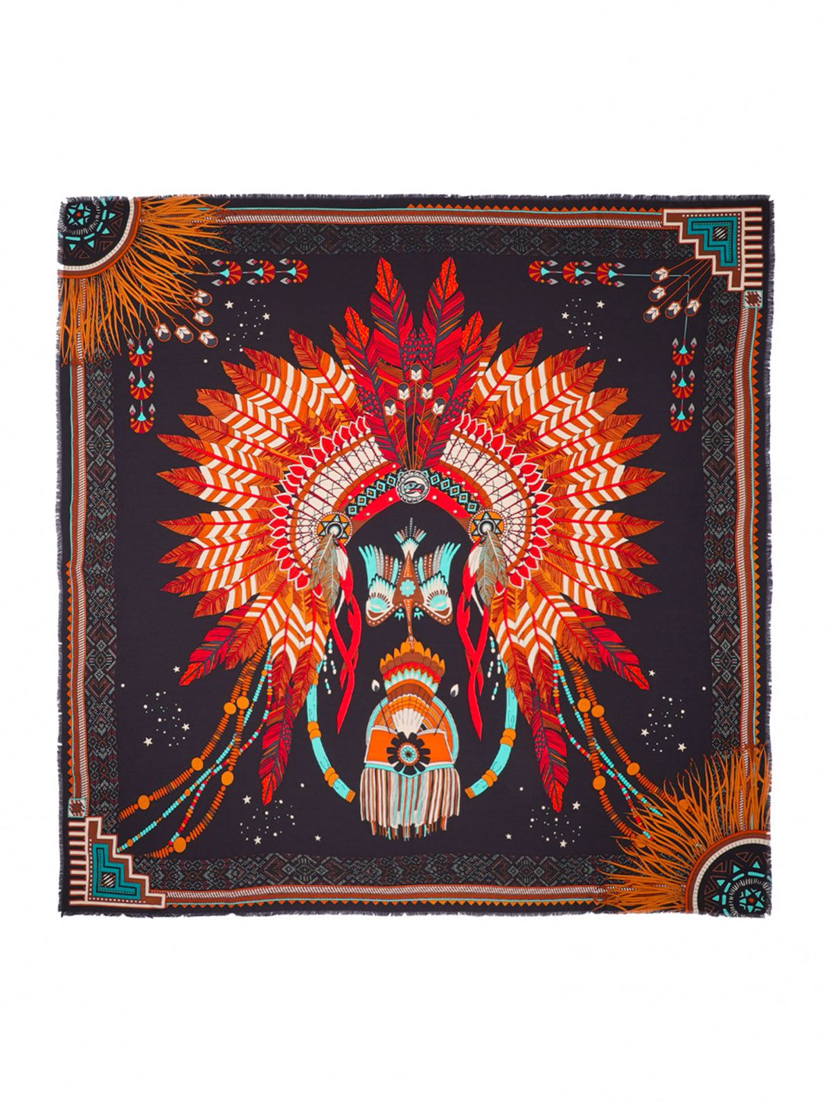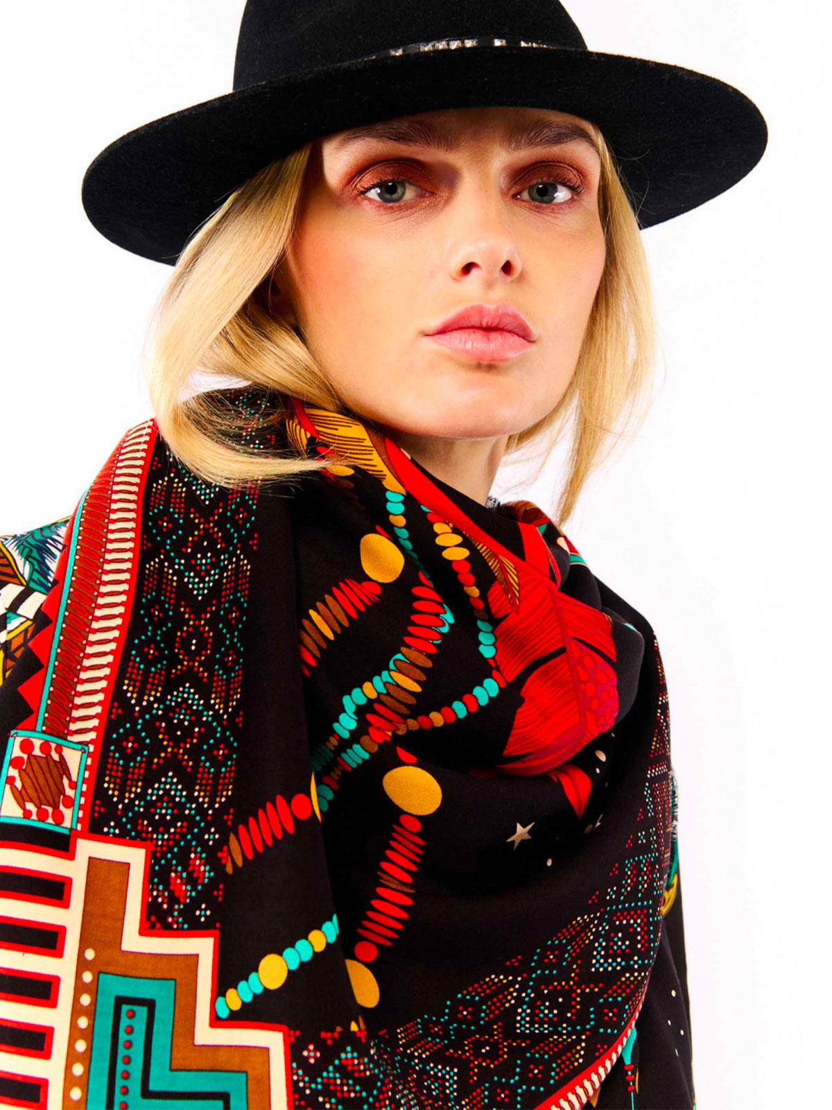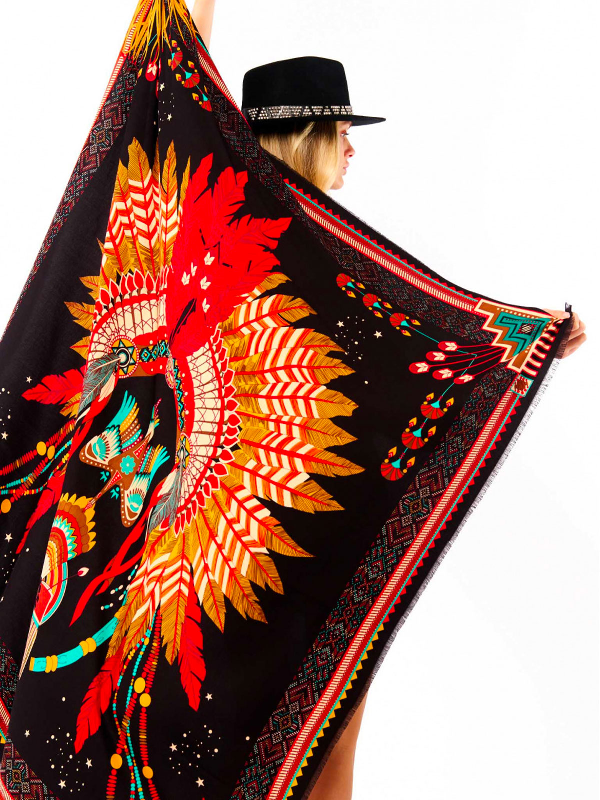 Quest’inverno, la stampa Nouveau Western è impreziosita da un sontuoso e imponente copricapo indiano al centro, impreziosito da simboli tribali su ogni angolo della sciarpa. Elemento fedele e ricorrente del DNA WILD, i motivi dei nostri bracciali brasiliani incorniciano elegantemente la sciarpa, fondendosi con i simboli emblematici del brand, come stelle, piume e bordi distintivi. Disponibile in tre colori, la versione nera presenta motivi color caramello, rosso, bianco, turchese e nero. Versatile, può essere indossata come sciarpa o pareo, a seconda del formato. Annodala al collo, in vita, come turbante o anche come accessorio chic sulla tua borsa.