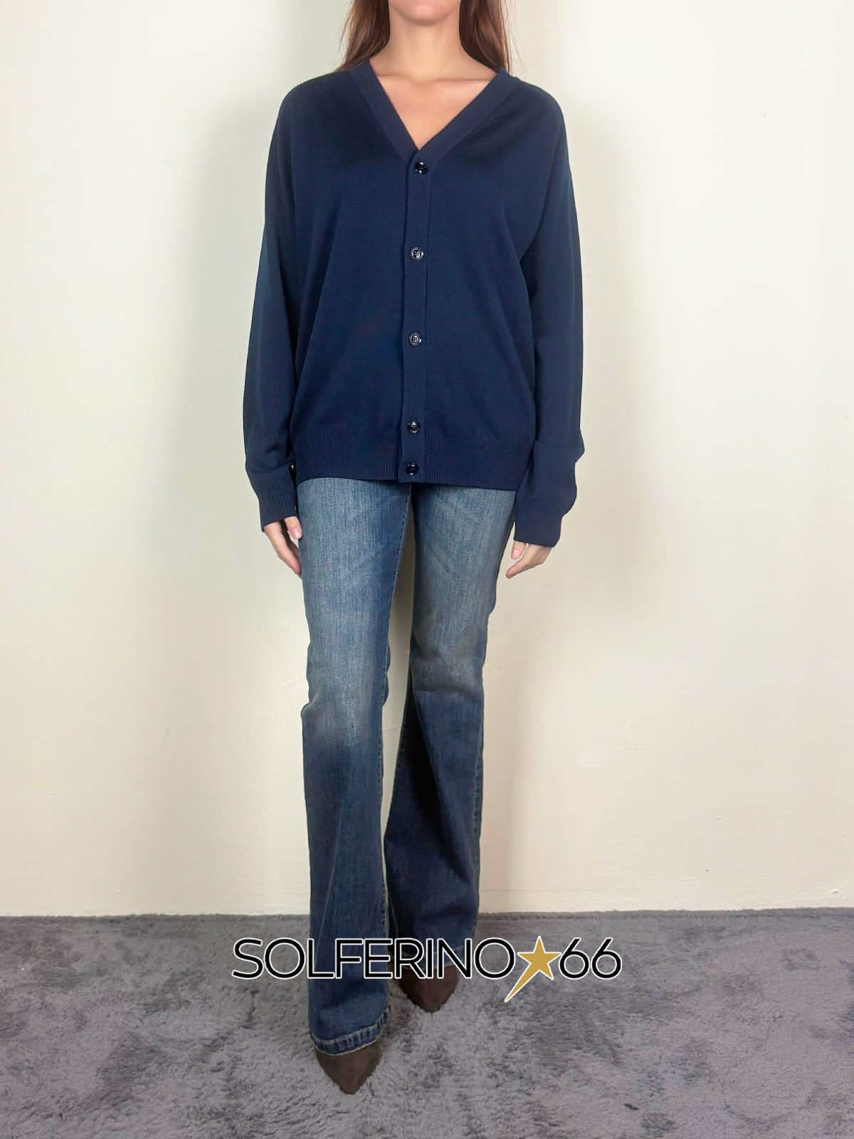 Cardigan a manica lunga in lana merino extra fine con scollo a V e chiusura con bottoni. Modello UNISEX.
